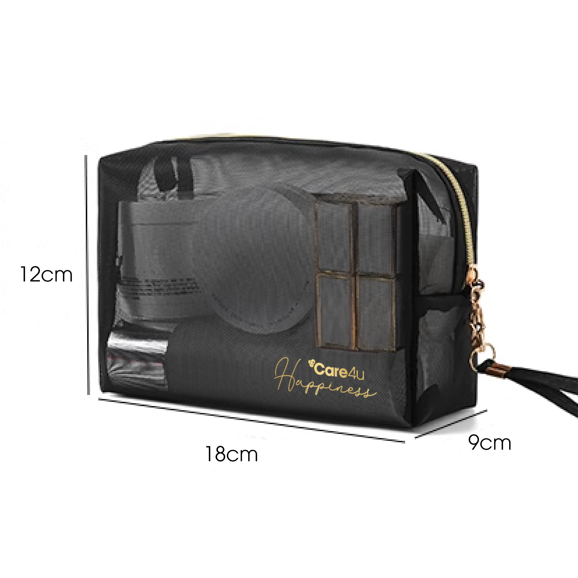 Kích thước: 21x12x13 cm Mô tả sản phẩm: Túi đựng mỹ phẩm cao cấp Care4u được thiết kế sang trọng, thanh lịch với dạng túi lưới thoáng khí siêu nhẹ, giúp bạn thuận tiện quan sát