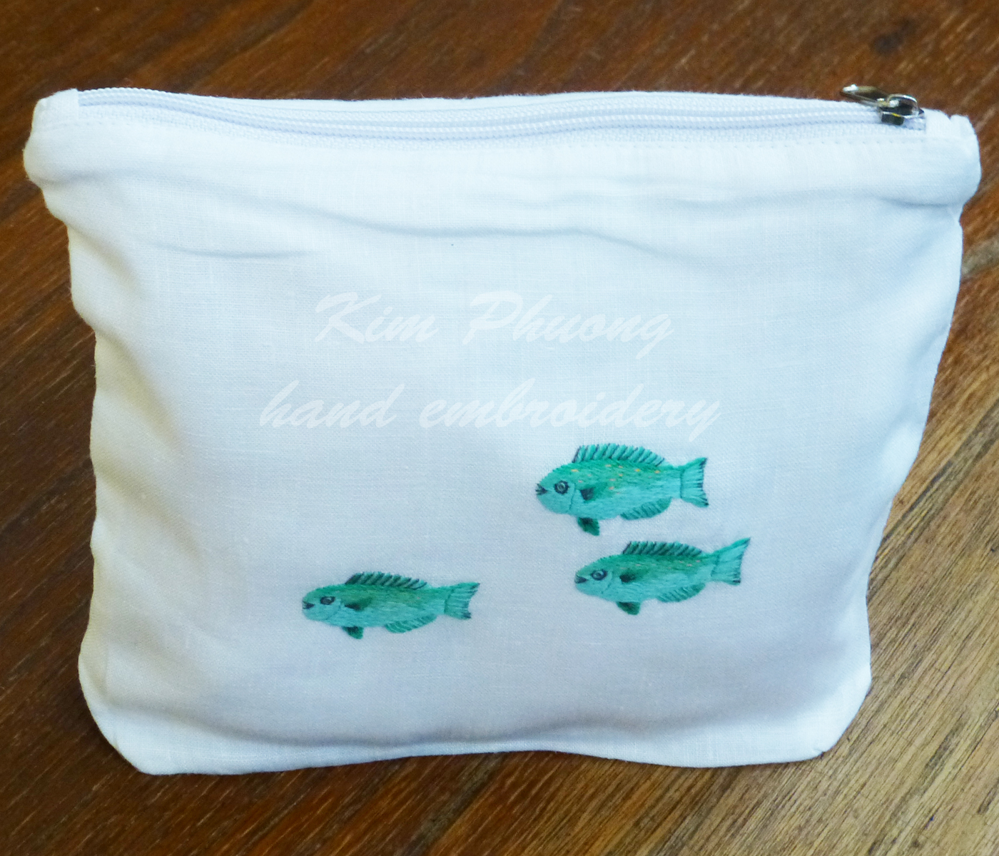 Túi mỹ phẩm thêu tay - 3 cá két xanh lá