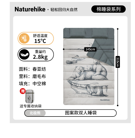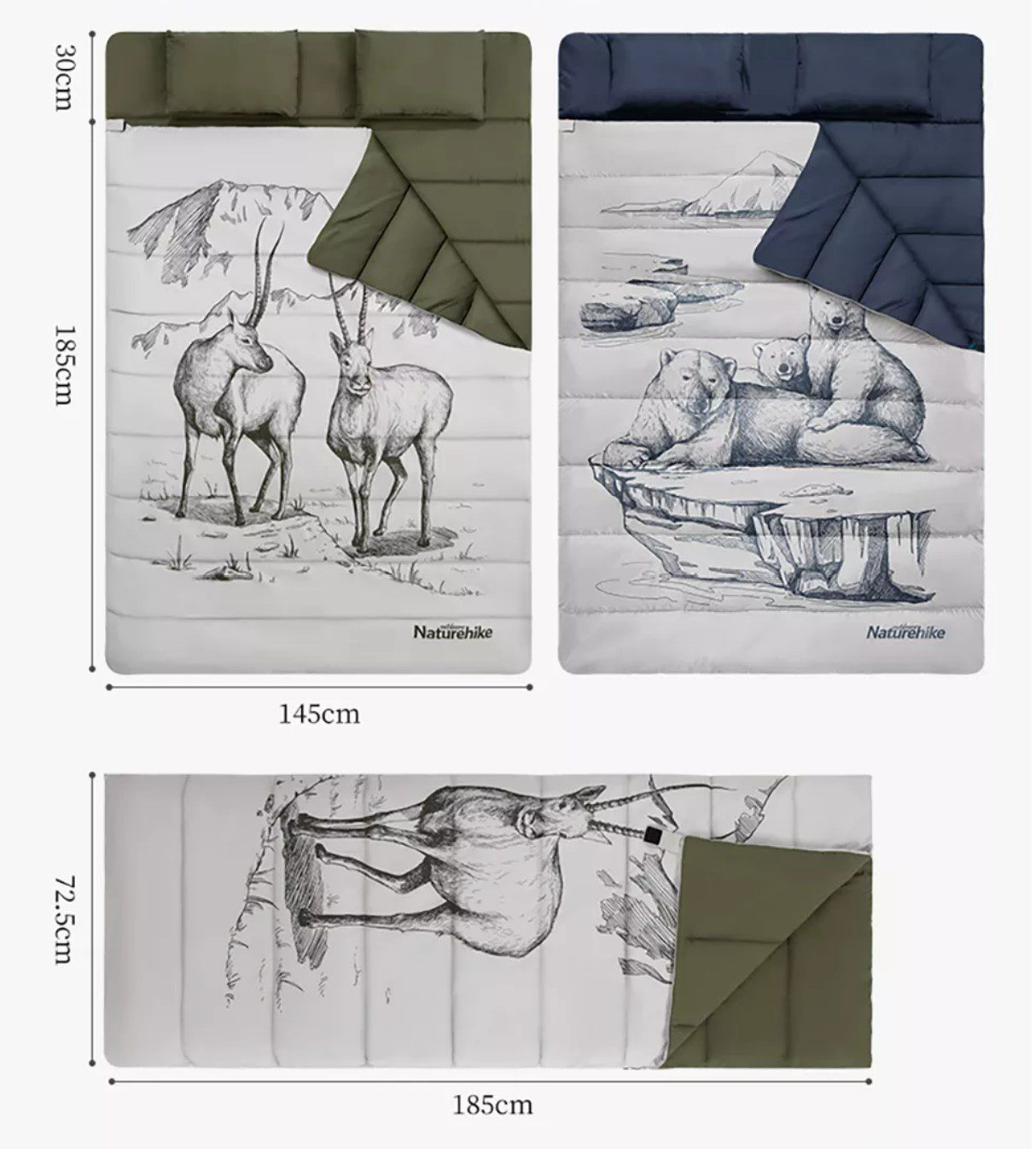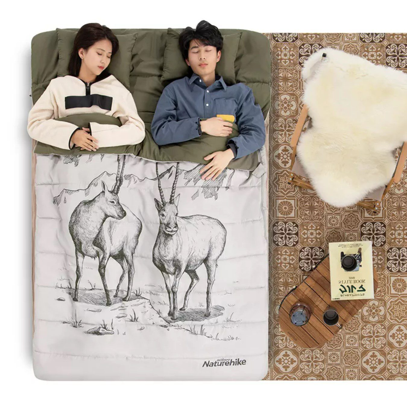 Túi ngủ đôi kèm gối NatureHike NH21MSD06 với họa tiết gấu Bắc Cực và Linh Dương Tây Tạng có ý nghĩa những người yêu thích cuộc sống ngoài trời luôn đầy sức sống và không gì ngăn cản được, mang tới trải nghiệm tuyệt vời, gần gũi hơn cho gia đình, người yêu, bạn bè… trong những chuyến du lịch, cắm trại, dã ngoại ngoài trời.