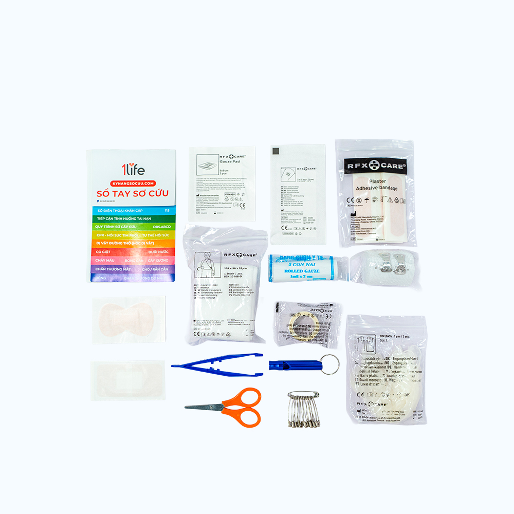 - Băng cá nhân chuẩn, Băng cá nhân lớn, Băng cá nhân hoạt hình, Băng đầu ngón tay + Gạc vô khuẩn, Gạc mắt + Băng tam giác và Kim băng, Băng cuộn y tế + Găng tay y tế + Băng keo lụa - Dụng cụ làm sạch: Bông tẩm cồn, Nước muối sinh lý, Tăm bông