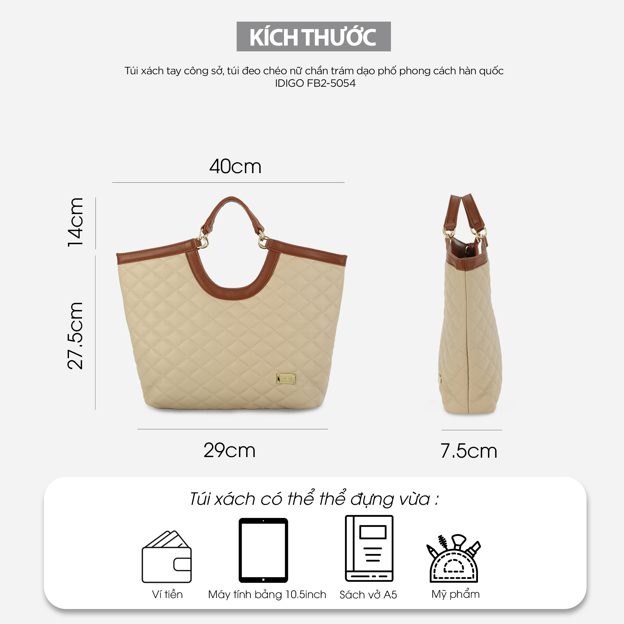 Chiếc Túi xách tay công sở, túi đeo chéo nữ chần trám dạo phố phong cách hàn quốc với thiết kế dáng hình thang cùng chi tiết chần trám lạ mắt tạo nên một phong cách vừa thanh lịch, lại rất hiện đại và tao nhã, ắt hẳn sẽ khiến cho các bạn siêu lòng ngay từ ánh nhìn đầu tiên. Túi xách tay công sở, túi đeo chéo nữ chần trám dạo phố phong cách hàn quốc này thích hợp cho cho các bạn mang đi làm, đi chơi, du lịch hay dạo phố, cà phê cùng bạn bè... - Kích thước: 29 x 7.5 x 27.5 x 40cm (Dài đáy x Rộng x Cao x Dài miệng) - Kích thước chiều cao có thể kéo khoá: 18cm - Màu sắc: Đen, Be, Kem, Nâu đậm - Chất liệu: Da tổng hợp - Trọng lượng: 460 gram - Xuất xứ: Trung Quốc - Số ngăn: 1 chính, 1 phụ nhỏ bên trong, 1 kéo nhỏ bên trong - Chiều cao quai xách tay: 14cm - Chiều dài dây đeo chéo: 110cm (có khoá thâu tăng giảm độ dài) - Cách đeo: (1) đeo chéo (2) đeo vai (3) xách tay Gam màu thanh lịch, bền màu với thời gian, đường may chắc chắn. Chất liệu da tổng hợp có độ mềm vừa đủ tạo nên phom dáng túi, vừa có độ đàn hồi, vừa chống thấm nước nhẹ, bền đẹp và dễ dàng vệ sinh. Phom túi hình thang với chất liệu da có độ mềm vừa phải giúp túi hạn chế bị cong vênh, nhăn gãy khi sử dụng. Bên trong túi có 1 ngăn chính thích hợp đựng máy tính bảng từ 10.5inch trở xuống, điện thoại, ví tiền (Có thể để tài liệu A4 trong trường hợp không kéo khoá)… Ngoài ra bên trong túi còn có 1 ngăn phụ nhỏ đựng các loại giấy tờ tuỳ thân, thẻ xe cùng 1 ngăn kéo nhỏ để được chìa khoá, mỹ phẩm… rất thích hợp sử dụng để đi làm, đi chơi, du lịch hay dạo phố. Túi có khóa kéo cao cấp hoạt động mượt mà và trơn tru, dây kéo bền & chắc chắn. Đặc biệt, luân phiên xách tay với quai xách cố định cao 14cm hoặc đeo chéo/đeo vai với dây da dài 110cm giúp thay đổi phong cách. Sản phẩm túi xách này được IDIGO đặt sản xuất tại nhà máy Trung Quốc và nhập khẩu chính ngạch về Việt Nam, có thông tin sản phẩm nhập khẩu in rõ ràng trên tem nhãn.