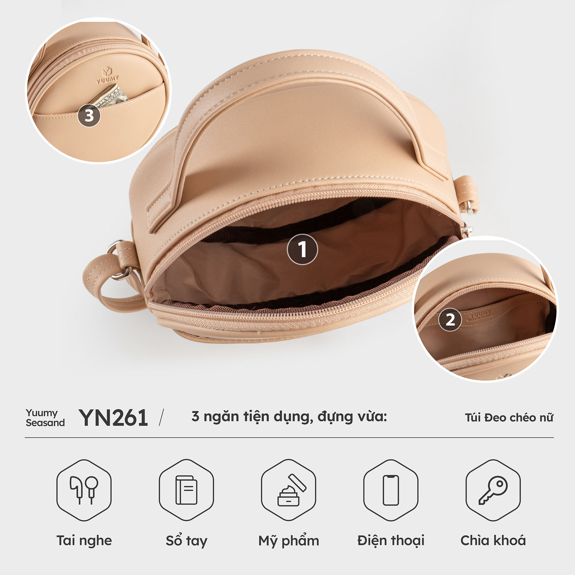Túi đeo chéo da nữ Yuumy Seasand YN204 hoàn thiện với những gam màu đẹp mắt, đơn giản nhưng không kém phần hiện đại rất dễ sử dụng và phối đồ. Điểm nhấn của chiếc