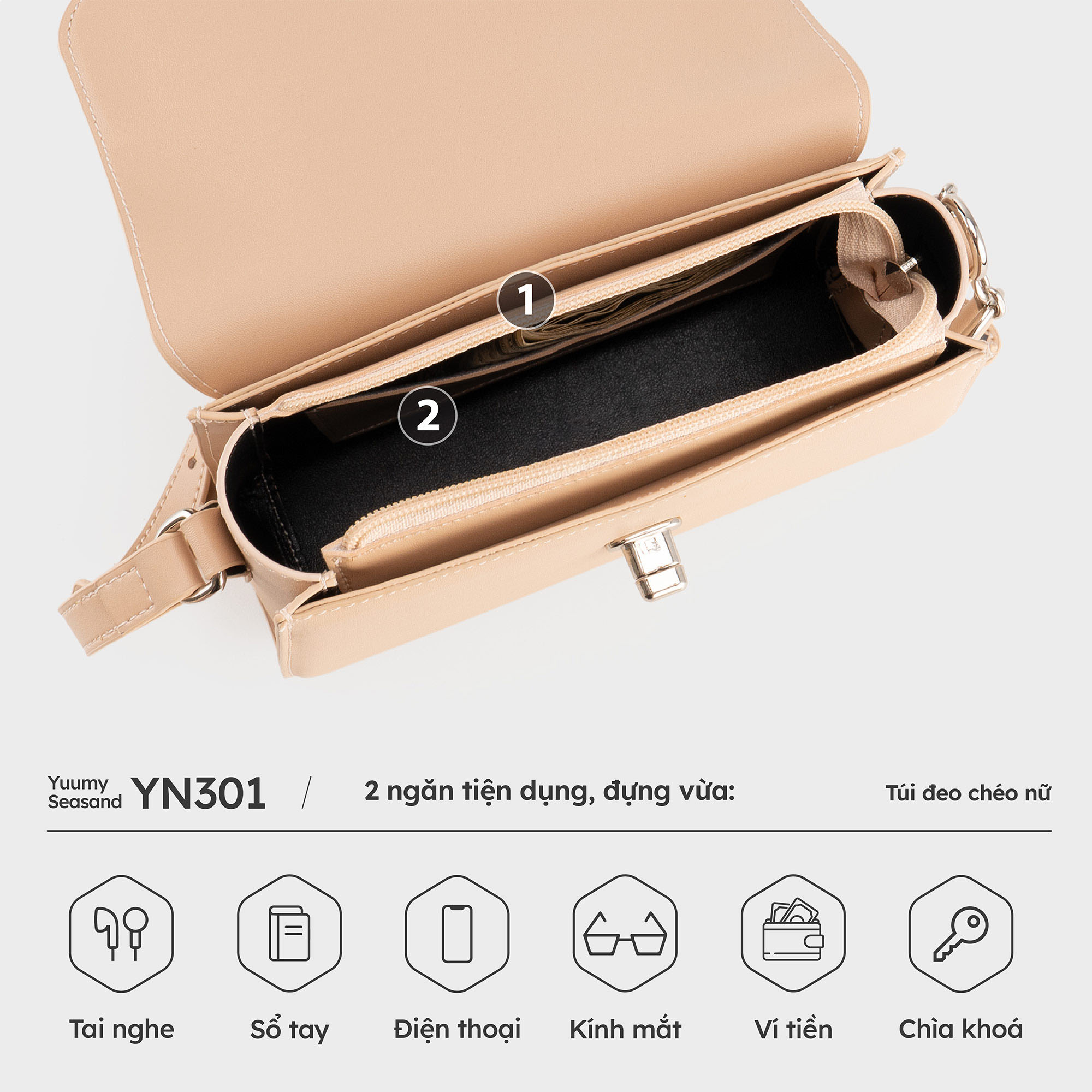 Một mẫu túi lý tưởng dành cho quý cô hiện đại yêu thích phong cách thanh lịch nhưng không kém phần thời thượng. Túi đeo chéo nữ Yuumy Seasand YN302 thiết kế phom hộp vuông