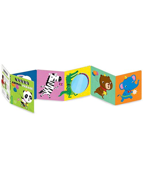 This small and sturdy accordion book opens up to stand alone in a crib, on the carpet, or on a bed, making it easy for your baby to enjoy tummy time, all the time. A perfect book for parents and caregivers home with babies this summer. One side features vibrantly illustrated creatures marching merrily along (an alligator bangs a big drum, a bear carries festive balloons) and the opposite side includes high-contrast black-and-white patterns and animals, perfect for baby's developing eyes. And with two reflective pages your baby can see him- or herself and practice those future smiles! Since the American Academy of Pediatrics and other top pediatric organizations around the world recommend tummy time to help "build the strength and coordination needed for rolling over, crawling, reaching, and playing," this book is not just fun, it's also good for your baby.