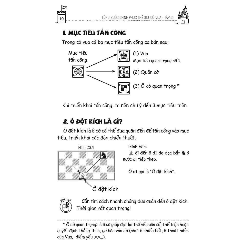 Ở tập 2 này, các em sẽ tiếp tục hành trình chinh phục thế giới cờ vua với những nội dung nền tảng như sau: cách tấn công vào các mục tiêu, cách phòng thủ có tính đến giá trị của các quân cờ, điểm xung đột, đòn chiến thuật tấn công đôi, những phương pháp chiếu hết căn bản, nguyên tắc khai cuộc và những sai lầm trong khai cuộc cần tránh, giúp các em tự tin hơn khi giao lưu cờ vua với các bạn.