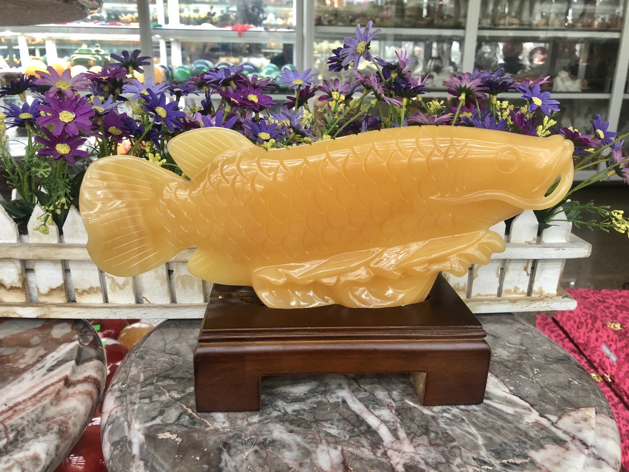 Chất liệu: Đá ngọc hoàng long Kích thước: Dài 30 cm x Rộng 10 cm x Cao 16,5 cm Khối lượng: 1,9 kg Do cá rồng là loài cá tượng trưng cho quyền lực oai