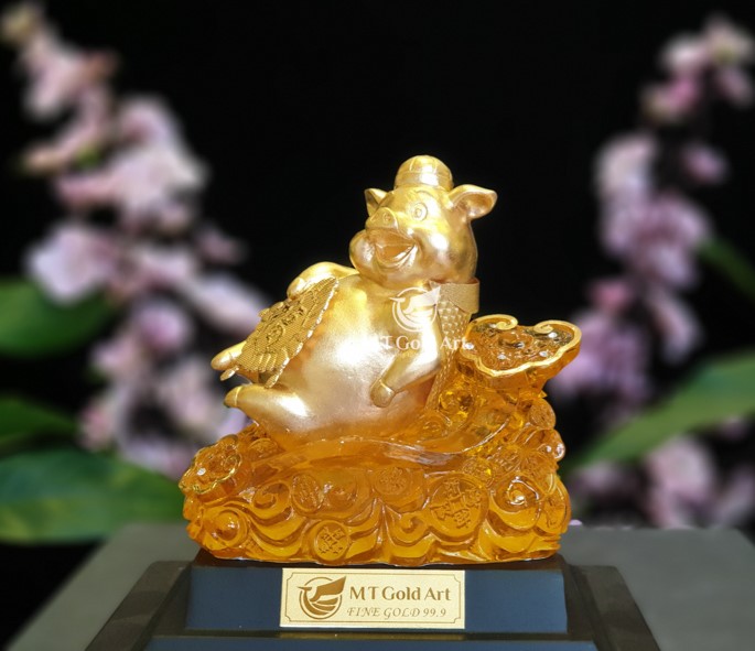Tượng heo dát vàng 24k là sản phẩm quà tết độc đáo, sang trọng, ý nghĩa. Với hình ảnh chú lợn đang thong dong đi trên đống tiền là biểu trưng cho một năm mới nhiều tiền tài, may mắn, cuộc sống an nhiên. Chú heo là biểu tượng của tuổi hợi và được gọi là con lợn vàng mang đến may mắn, tài lộc. Tượng heo dát vàng 24k là món quà tết sang trọng, ý nghĩa tặng khách hàng, bố mẹ
