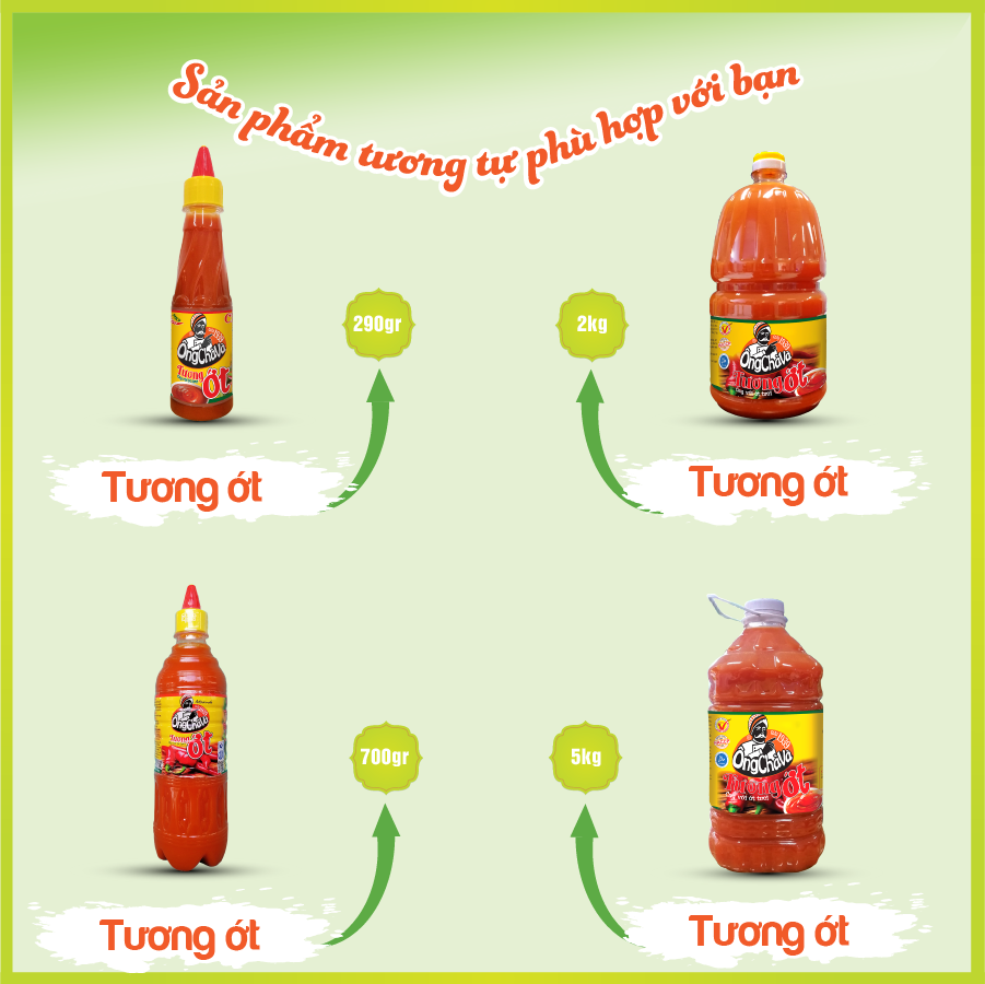 CHI TIẾT SẢN PHẨM 1. Khối lượng: 830gThành phần: Nước, ớt (25%), đường, cà chua, tỏi, muối ăn, dấm,… 2. Quy cách đóng gói: 12 chai/thùng 3. Loại chai: PET. 4. Hướng dẫn bảo quản: