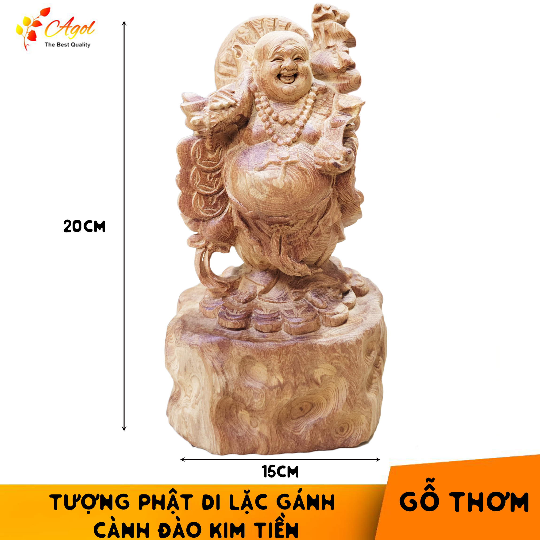 Tượng Di Lặc Gánh Cành Đào Kim Tiền được chế tác từ chất liệu gỗ thơm liền khối, tác phẩm có kích thước cao 20 ngang 10 sâu 8 cm.