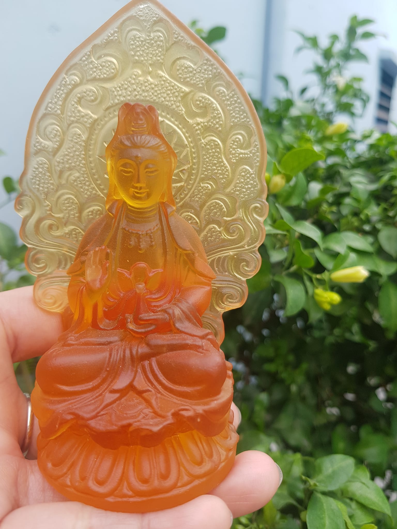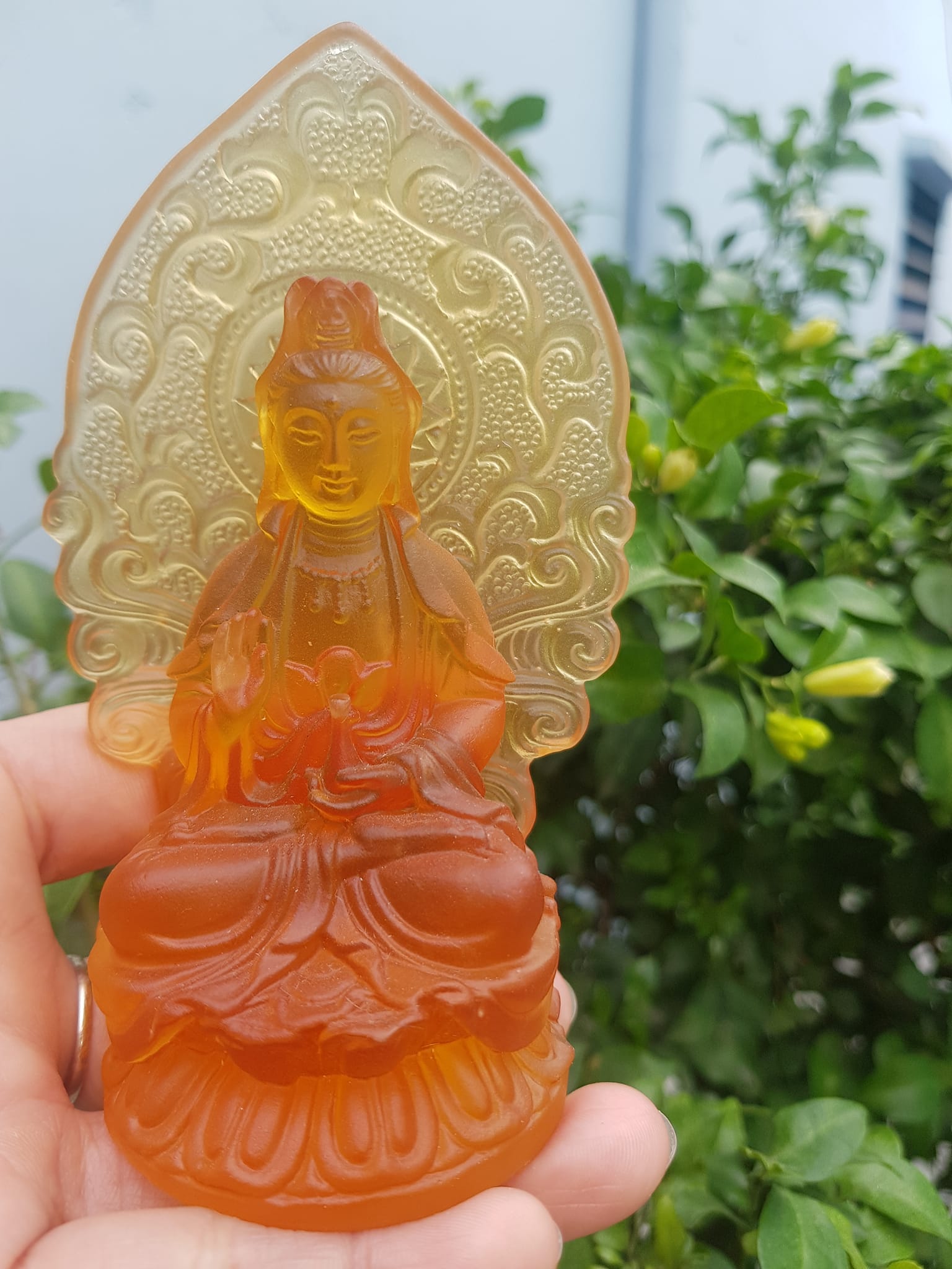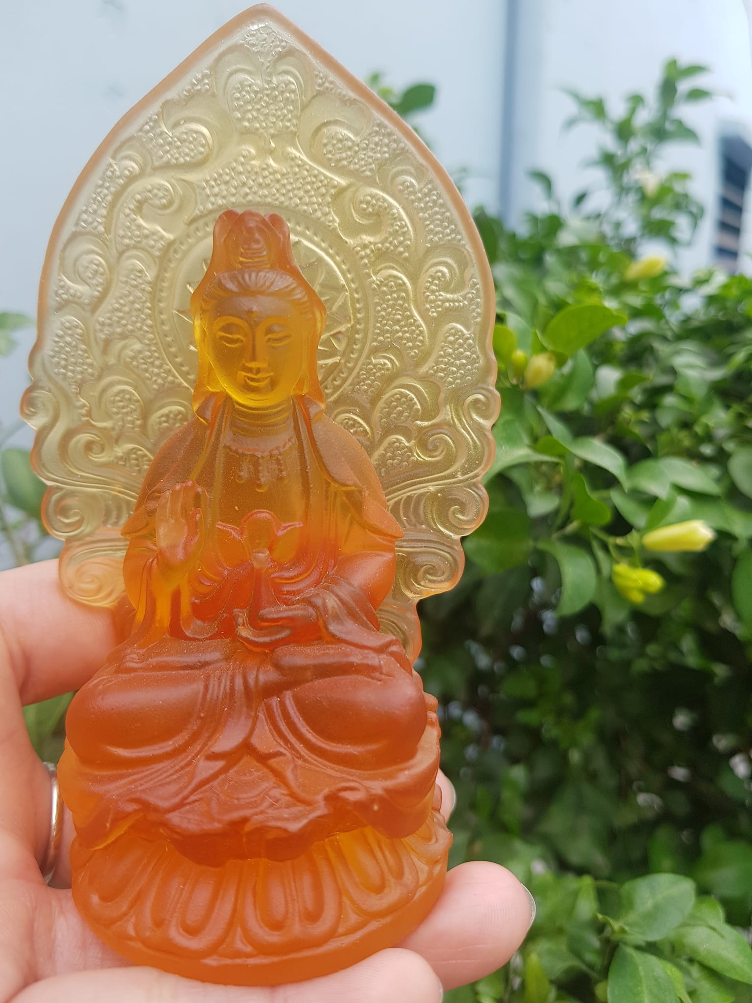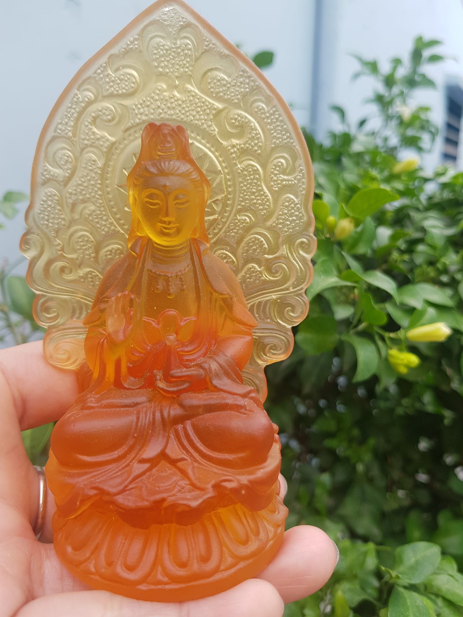 TƯỢNG PHẬT BÀ QUAN ÂM 2 MẶT ĐÁ LƯU LY VÀNG ĐẬM ĐỂ TRONG XE HƠI 10cmx6cm - HÀNG PHONG THUỶ SUNNY Q8