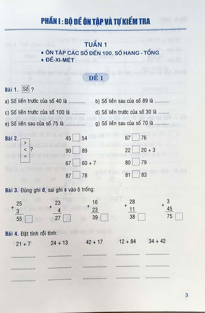 • Phần 1: Bộ đề ôn tập và tự kiểm tra. Phần này gồm hệ thống các đề ôn luyện được trình bày theo từng phần, mỗi tuần có 2 đề, mỗi đề có 8 bài. Các bài tập trong mỗi đề được chọn lọc theo các kiến thức và kĩ năng mà các em được học trong tuần đó, cùng một số kiến thức có liên quan trong những tuần trước. Đặc biệt, cuối mỗi đề có một số bài nâng cao giúp các em làm quen với những dạng toán khó. Trong mỗi cuốn có 5 đề tự kiểm tra giữa kì và 5 đề tự kiểm tra cuối kì, giúp các em tham khảo và tự làm bài kiểm tra để chuẩn bị tốt cho các bài thi giữa kì và cuối kì trên lớp.