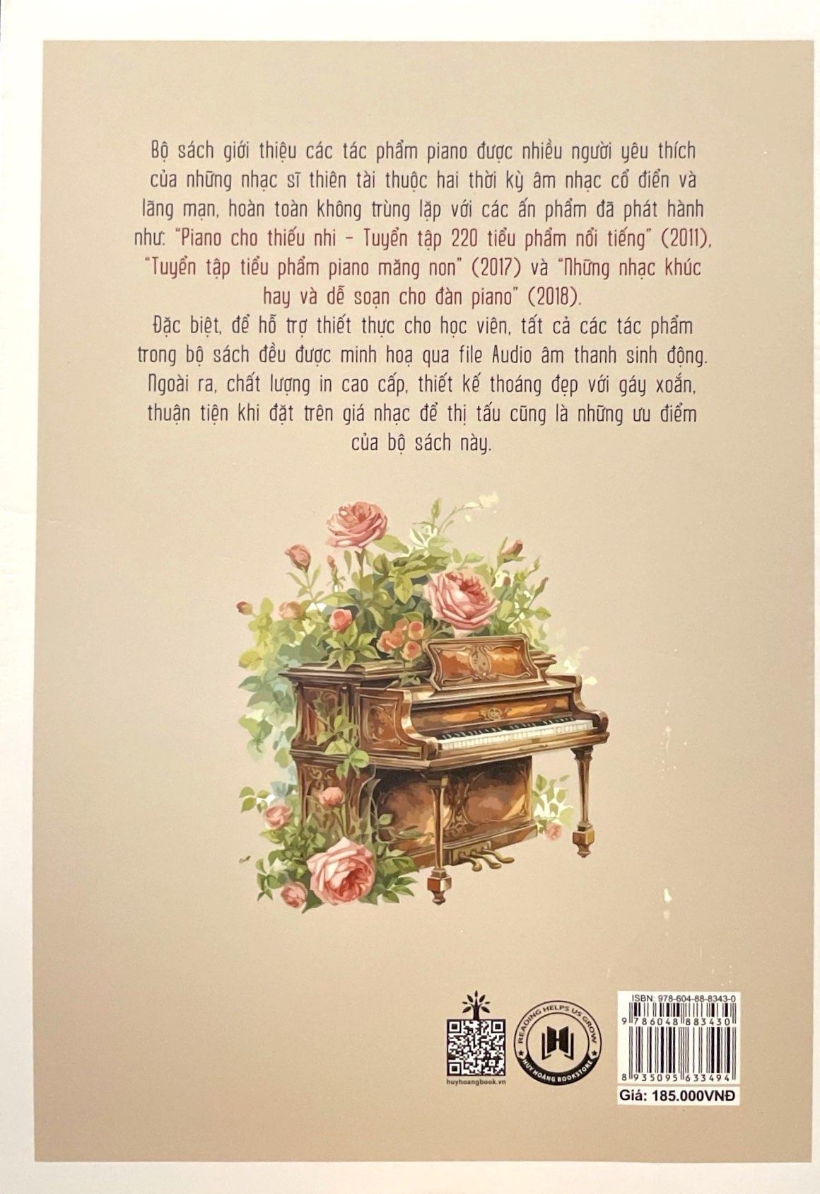 Bộ sách giới thiệu các tác phẩm piano được nhiều người yêu thích của những nhạc sĩ thiên tài thuộc hai thời kỳ âm nhạc cổ điển và lãng mạn, hoàn toàn không trùng lặp với các ấn phẩm đã phát hành như: “Piano cho thiếu nhi – Tuyển tập 220 tiểu phẩm nổi tiếng” (2011), “Tuyển tập tiểu phẩm piano măng non” (2017) và “Những nhạc khúc hay và dễ soạn cho đàn piano” (2018). Đặc biệt, để hỗ trợ thiết thực cho học viên, tất cả các tác phẩm trong bộ sách đều được minh họa qua file Audio âm thanh sinh động. Ngoài ra, chất lượng in cao cấp, thiết kế thoáng đẹp với gáy xoắn, thuận tiện khi đặt trên giá nhạc để thị tấu cũng là những ưu điểm của bộ sách này.