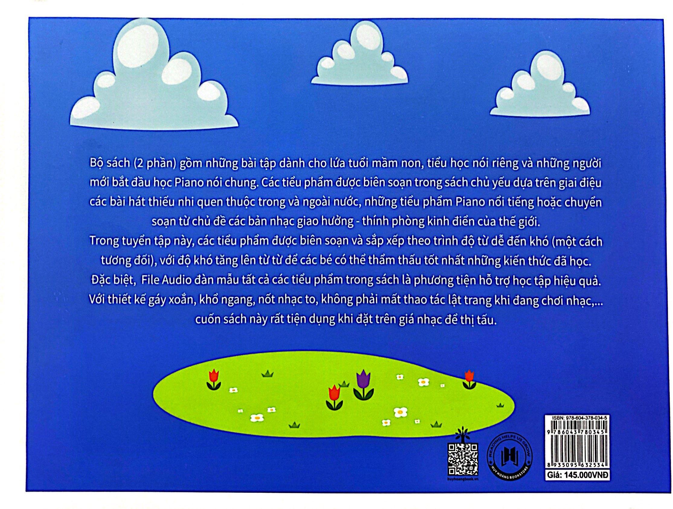 Mua tại TiktokBộ sách (2 phần) gồm những bài tập dành cho những lứa tuổi mầm non, tiểu học nói riêng và những người học mới piano nói chung. Các bài hát trong sách chủ yếu dựa vào các giai điệu, các bài hát thiếu nhi trong và ngoài nước, những tiểu phẩm piano nổi tiếng hoặc soạn từ các bản nhạc giao hưởng - thính phòng kinh điển của thế giới.