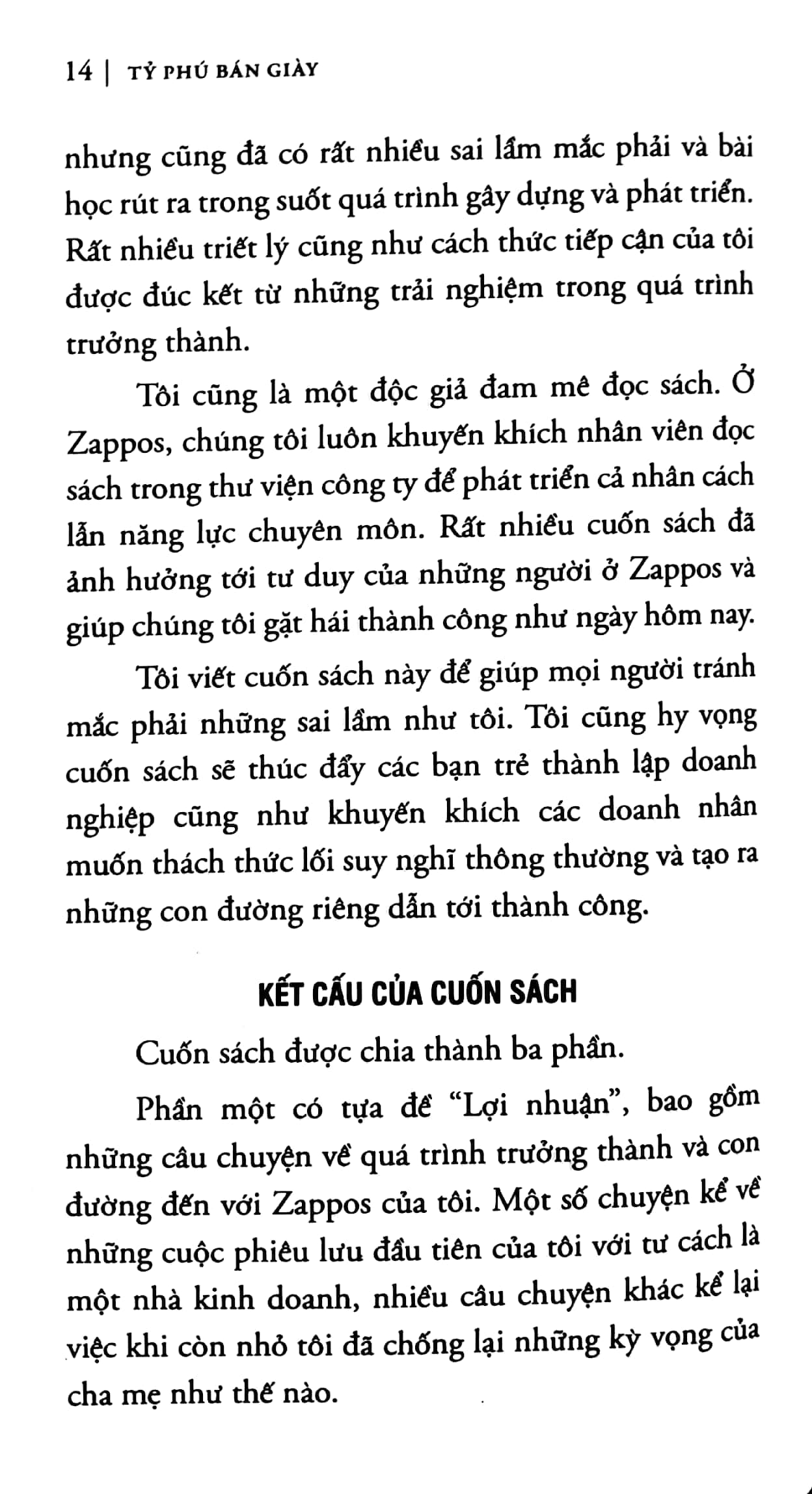 Tỷ Phú Bán Giày không phải là một cuốn sách dạy cách làm giàu tuần tự theo các bước 1 - 2 - 3, cũng không hẳn là một cuốn sách chỉ dẫn bí quyết kinh doanh hay nghệ thuật quản lý. Là hành trình tìm ra chân lý của Hạnh phúc, Đam mê và Lợi nhuận, Tỷ Phú Bán Giày kể câu chuyện về thành công và thất bại của tác giả từ những thương vụ kinh doanh được từ khi 9 tuổi. Những trang trại giun đất, làm cúc áo thủ công, bán pizza ở Harvard, đã trở thành nền móng cho một LinkExchange và sau này là Zappos lừng danh.Với Tỷ Phú Bán Giày, người đọc sẽ nhận được cảm hứng, nhiệt tình và cả một chút điên rồ cho những ý tưởng kinh doanh mà nghe qua tưởng như rất liều mạng. Nhưng với Zappos, Tony Hsieh đã tạo dựng được một thương hiệu về "văn hóa công ty" - chìa khóa thành công để theo đuổi một môi trường làm việc năng động và những dịch vụ xuất sắc.Là cuốn sách bán chạy nhất trên trang A: xếp thứ 1 trong các sách về Dịch vụ khách hàng; xếp thứ 5 trong các sách về Marketing và Bán hàng; và xếp thứ 7 trong các sách về Quản lý.Cuốn sách là một câu chuyện về một doanh nghiệp thành công, trong đó, Tony Hseih chia sẻ những bài học kinh doanh khác nhau mà ông đã học được trong cuộc đời, từ một quầy bán nước chanh và cửa hàng bán pizza cho tới LinkExchange, Zappos.Hsieh – CEO của Zappos đã trưởng thành từ một cậu sinh viên làm kinh doanh của trường Harvard non nớt thành nhà sáng lập của một thương hiệu cực kỳ lớn mạnh sau những năm tháng làm việc như một kẻ lập dị về lĩnh vực dot com và đã có những lúc tưởng như khánh kiệt và phải bán hết các tài sản mà anh có để có vốn hoạt động. Sau khi bán công ty mạng LinkExchange cho Yahoo! vào năm 1999 với 265 triệu đô la, Heish đã tham gia sáng lập Zappos và giúp công ty này đạt được tăng trưởng ngoạn mục, với doanh thu hơn 1 tỉ đô la.Tính đến khi Zappos được mua lại bởi Amazon với hơn 1.2 tỉ đô la vào năm 2009, Hsieh và nhóm cộng sự của anh đã xây dựng được văn hoá doanh nghiệp độc đáo với việc tập trung vào việc trao quyền lực cho nhân viên và lời hứa đem lại hạnh phúc thông qua sự hài lòng của khách hàng và một nơi làm việc tốt đẹp.Tỉ phú bán giày - Câu chuyện về công ty Z được Amazon mua lại với giá 1.2 tỉ đô (Delivering Happiness) là một câu chuyện về một doanh nghiệp thành công, trong đó, Tony Hseih chia sẻ những bài học kinh doanh khác nhau mà ông đã học được trong cuộc đời, từ một quầy bán nước chanh và cửa hàng bán pizza cho tới LinkExchange, Zappos…Ông cũng đã lý giải việc tập trung vào văn hoá doanh nghiệp có thể dẫn tới những thành công không thể ngờ như thế nào: khiến dịch vụ khách hàng trở thành nhiệm vụ của toàn công ty, không phải chỉ một bộ phận; tập trung vào văn hoá doanh nghiệp như ưu tiên số 1; áp dụng nghiên cứu từ khoa học về hạnh phúc vào việc điều hành doanh nghiệp; giúp nhân viên trưởng thành trong cuộc sống và sự nghiệp.Cuối cùng, ông cho chúng ta thấy hiệu quả của việc dùng sự hạnh phúc như một khuôn khổ có thể tạo ra lợi nhuận, đam mê, và mục đích trong cả công việc và trong cuộc sống. Trên A, "Tỉ phú bán giày - Câu chuyện về công ty Z được Amazon mua lại với giá 1 tỉ đô" xếp thứ 23 trong số 100 các cuốn sách bán chạy nhất, xếp thứ nhất trong các sách bán chạy nhất về Quản lý, xếp thứ nhất trong các cuốn sách bán chạy nhất về Dịch vụ khách hàng và xếp thứ nhất trong các cuốn sách về kỹ năng Truyền thông.“Cuốn sách này thật đáng kinh ngạc. Cách mà Tony giúp doanh thu của Zappos tăng trưởng đến 1 tỉ đô la trong 10 năm mới chỉ là sự khởi đầu. Từ việc gây vốn tới việc tìm kiếm được hạnh phúc, từ các thư từ thực tế tới các checklists đều mang đúng nghĩa của nó. Đặc biệt cá nhân và đặc thiết thực.”