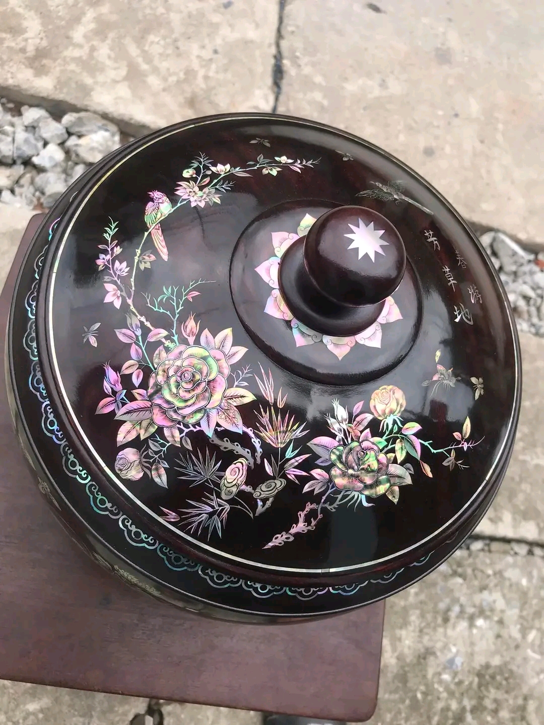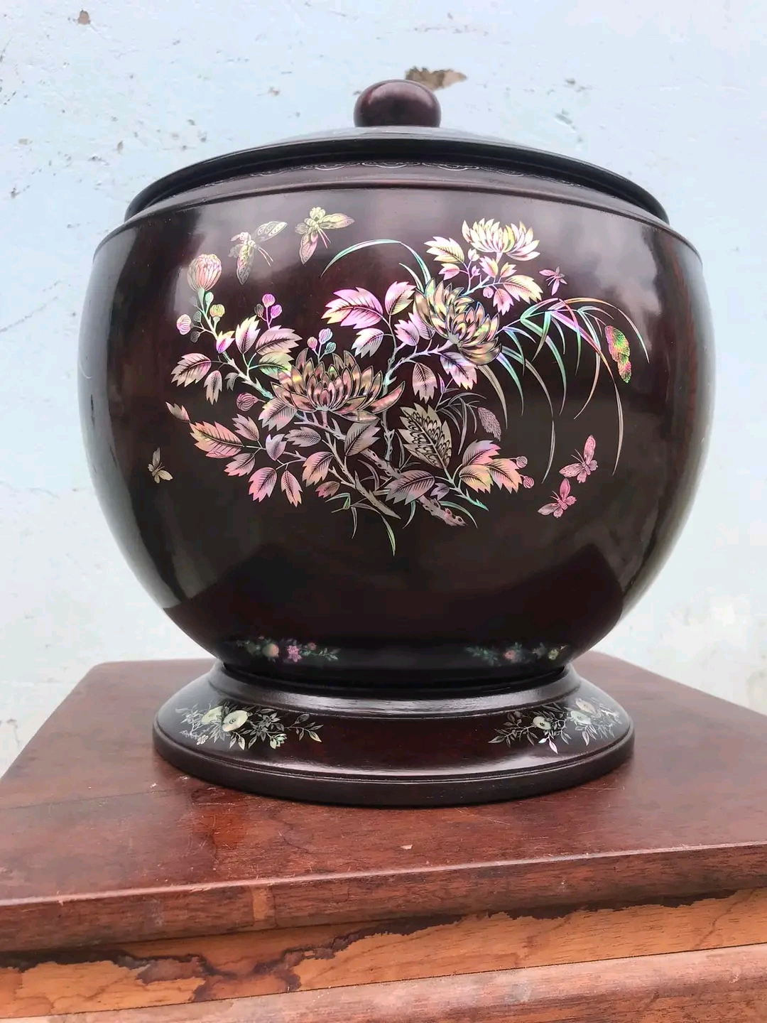 _ giỏ ủ bình trà được làm bằng chất liệu gỗ gụ ,kết hợp với khảm ốc đỏ và vỏ bào ngư xanh đỏ tự nhiên 100% _ Kt cao 31 thân tròn rộng 32cm