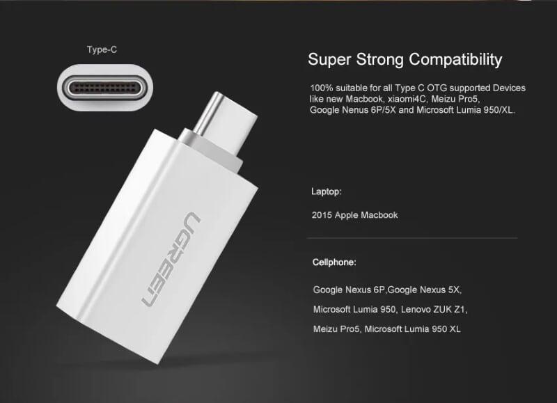 Ugreen 30155 usb 3.1 type c superspeed male to usb 3.0 type a female adapter trắng us173 1. Features: Convert USB-C to USB 3.0 - use data transfer. 2. Color: White 3. Material: ABS 4.