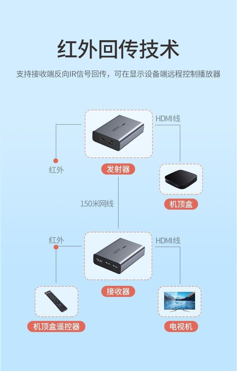 - Receiver: Input: 1RJ45 female & 3.5mm port (for infrared), output: 1HDMI female & 2*USB female(for keyboard and mouse)