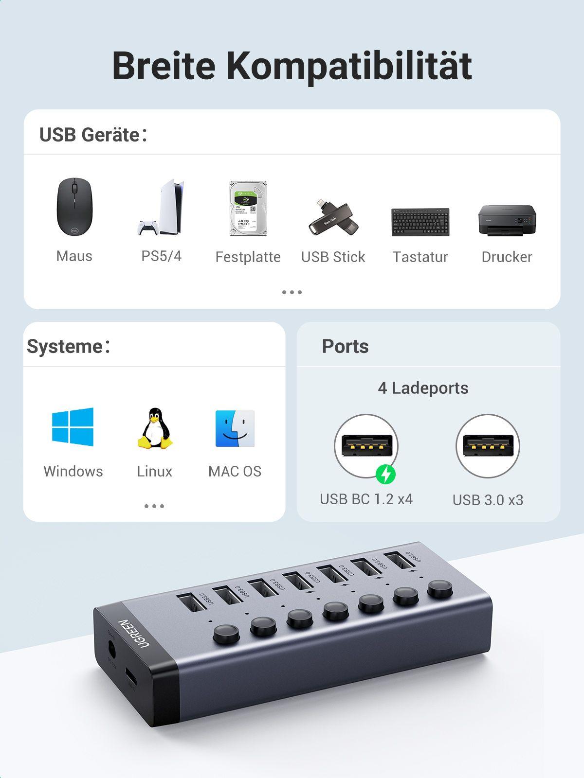 1.Input: 1x USB-C Female (data transfer only) 2.Output: 7x USB3.0 Female 3.Total Output: 5V/3.4A Max 4.Power Supply: DC 5.5mm, 12V/2A 5.USB3.0 5Gbps 6.Compliance with BC 1.2 fast charging protocol (only available for USB3.0 ports from