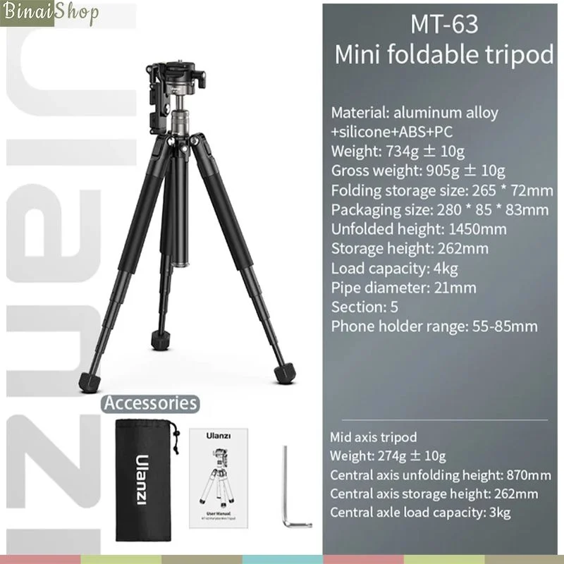 - 01 Sách hướng dẫn THÔNG SỐ KỸ THUẬT Brand Ulanzi Material Aluminum Weight Around 734g Max Height 1450mm Min Height 262mm Folded Height 262mm Max Load 4kg Max Diameter 21mm Leg Saction 5 Mobile Phone Clip Range 55-85mm Keyword: MT-63, tripod mini, tripod máy ảnh, tripod điện thoại, tripod cầm tay, tripod du lịch, tripod để bàn, tripod giá rẻ, tripod Ulanzi, MT-63, phụ kiện chụp ảnh .