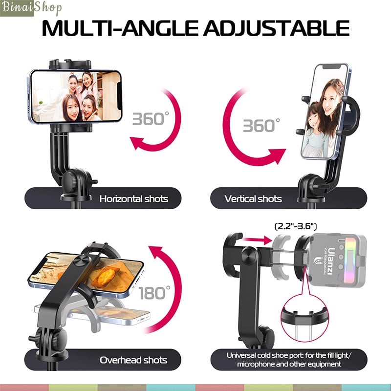- Kẹp điện thoại mở rộng từ 56-92mm, xoay 360°, nghiêng 180°, có thêm ngàm mở rộng để gắn các thiết bị hỗ trợ như: micro, đèn LED