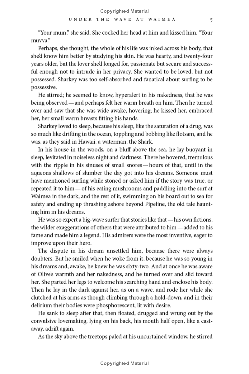 Now in his sixties, big-wave surfer Joe Sharkey has passed his prime and is losing his “stoke.” The younger surfers around the breaks on the north shore of Oahu still idolize the Shark, but his sponsors are looking elsewhere. One night, while driving home from a bar after one too many, Joe accidentally kills a stranger near Waimea, a tragedy that sends his life out of control. As the repercussions of the accident spiral ever wider, Joe’s devoted girlfriend Olive throws herself into uncovering the dead man’s identity and helping Joe find vitality and refuge in the waves again.