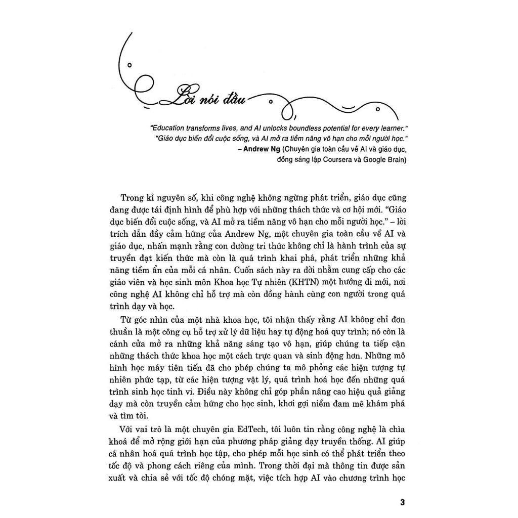 Trong kỉ nguyên số, khi công nghệ không ngừng phát triển, giáo dục cũng đang được tái định hình để phù hợp với những thách thức và cơ hội mới. “Giáo dục biến đổi cuộc sống, và AI mở ra tiềm năng vô hạn cho mỗi người học.” – lời trích dẫn đầy cảm hứng của Andrew Ng, một chuyên gia toàn cầu về AI và giáo dục, nhấn mạnh rằng con đường tri thức không chỉ là hành trình của sự truyền đạt kiến thức mà còn là quá trình khai phá, phát triển những khả năng tiềm ẩn của mỗi cá nhân. Cuốn sách này ra đời nhằm cung cấp cho các giáo viên và học sinh môn Khoa học Tự nhiên (KHTN) một hướng đi mới, nơi công nghệ AI không chỉ hỗ trợ mà còn đồng hành cùng con người trong quá trình dạy và học.