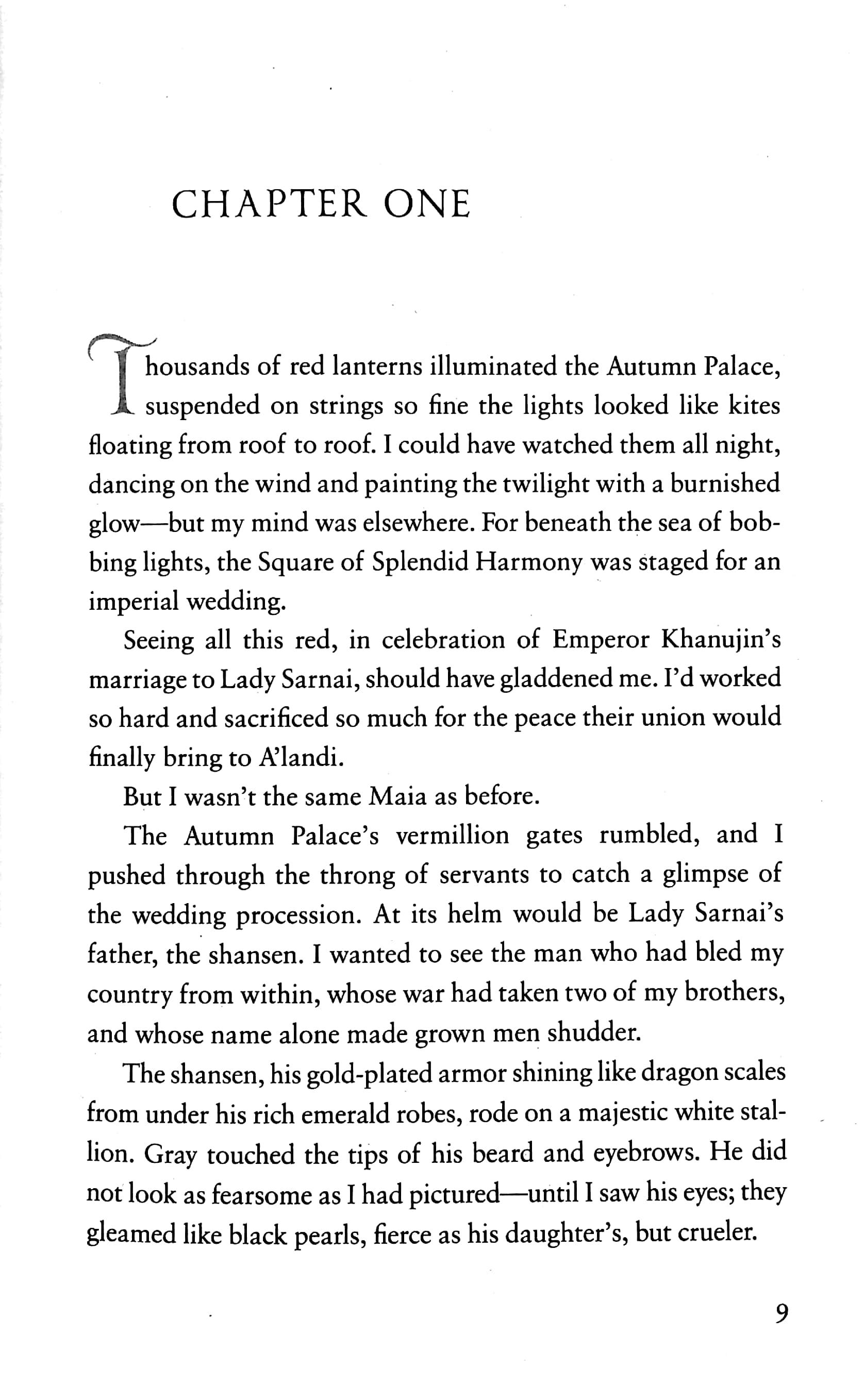 Maia Tamarin's journey to sew the dresses of the sun, the moon, and the stars has taken a grievous toll. She returns to a kingdom on the brink of war. Edan, the boy she loves, is gone--perhaps forever--and no sooner does she set foot in the Autumn Palace than she is forced to don the dress of the sun and assume the place of the emperor's bride-to-be to keep the peace. When the emperor's rivals learn of her deception, there is hell to pay, but the war raging around Maia is nothing compared to the battle within.