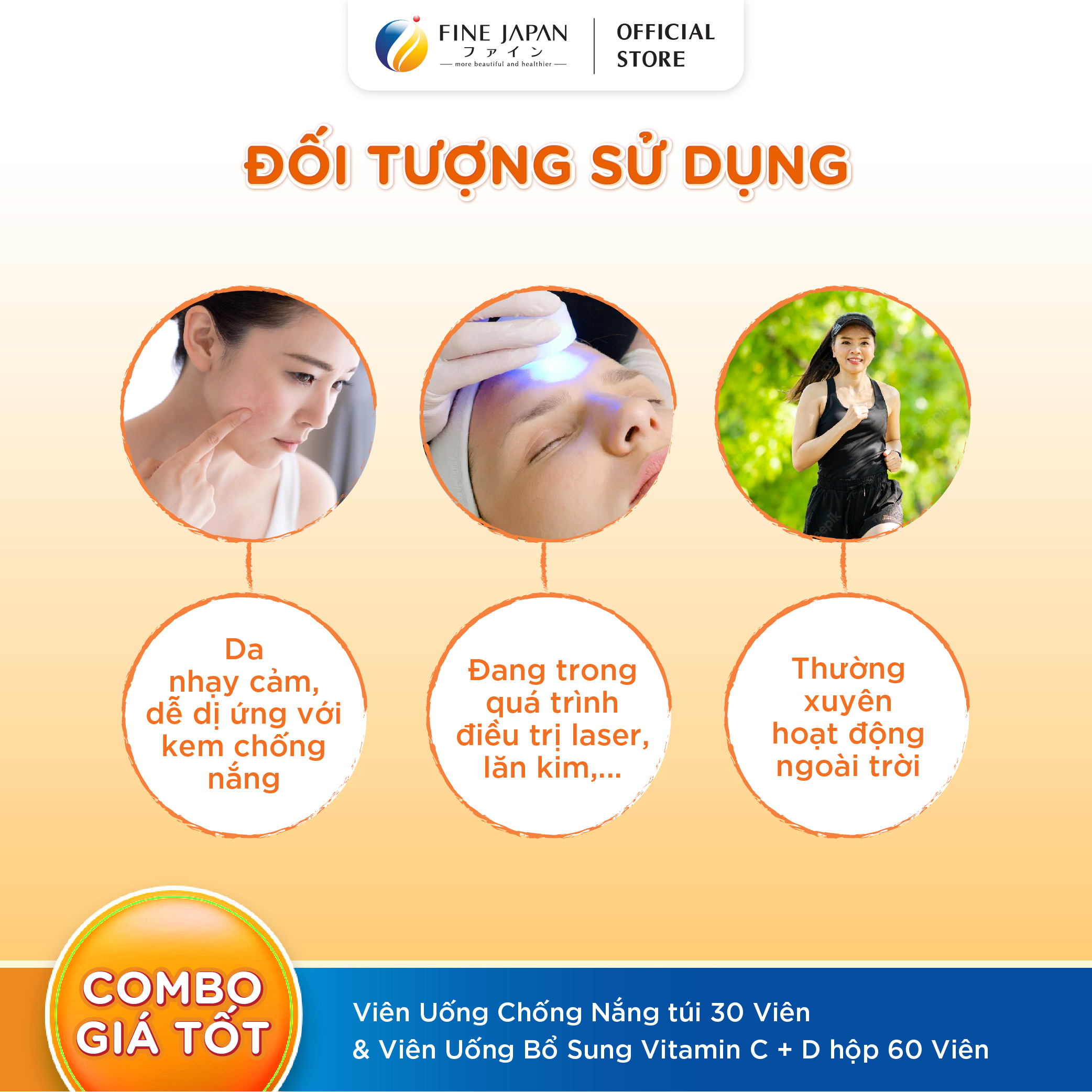 Mua tại TiktokCombo Chống nắng sáng da Fine Japan - Viên uống chống nắng & Viên uống bổ sung Vitamin C + D đang được các cô nàng Nhật Bản ưa chuộng, thay thế cho việc sử dụng kem chống nắng hàng ngày vô cùng hiệu quả. Với các thành phần chiết xuất từ thiên nhiên cung cấp vitamin và các chất chống oxy hoá, củng cố hàng rào bảo vệ da, giúp chống các tác hại của tia cực tím từ trong ra ngoài, để làn da luôn trắng hồng, mịn màng, bất kể nắng gắt.