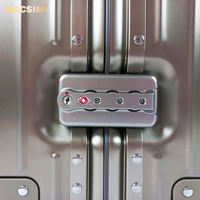 Toàn bộ thân vỏ vali Macsim làm bằng hợp kim nhôm A6063 làm cho vali rất nhẹ, độ đàn hồi cao, chống ăn mòn, chịu được tải trọng lớn.