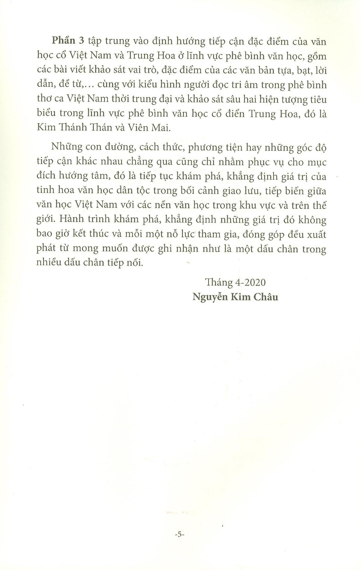 Cuốn sách này tập hợp một số bài báo và tham luận đã đăng trên các tạp chí khoa học chuyên ngành hoặc các kỷ yếu hội thảo khoa học, được người viết thực hiện trong 10 năm gần đây. Điểm chung của các bài viết là đều hướng tới mục đích tìm hiểu, khảo sát một số hiện tượng văn học nhằm chứng minh mức độ tương thích, hiệu quả cũng như khả năng tới hạn của các lý thuyết nghiên cứu phê bình văn học phương Tây khi được vận dụng vào nghiên cứu văn học cổ Việt Nam và Trung Hoa.