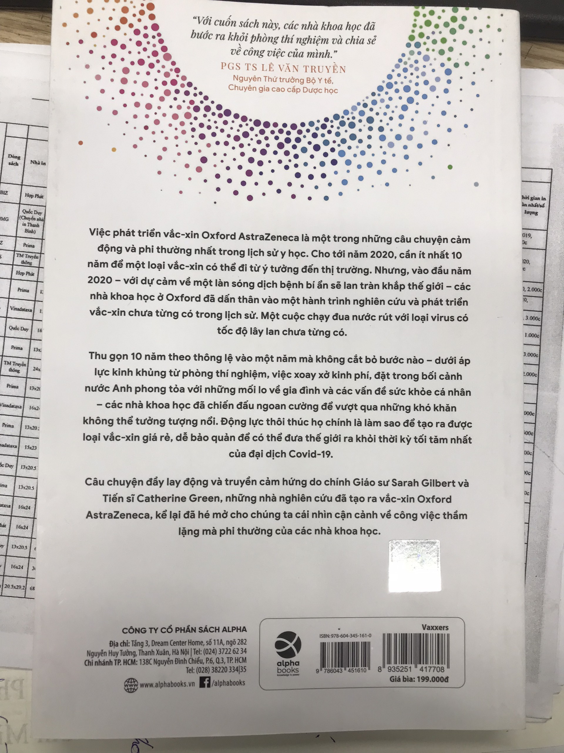 Trong cuốn sách này, chúng ta được nghe trực tiếp từ Giáo sư Gilbert và đồng nghiệp của bà, Tiến sĩ Catherine Green, khi họ tiết lộ câu chuyện về việc điều chế vắc-xin Oxford AstraZeneca cũng như thứ khoa học tiên tiến và công việc cực kỳ chăm chỉ để tạo ra nó.