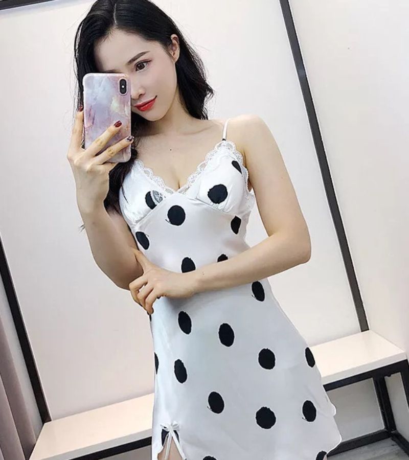 Đầm ngủ lụa thiết kế cao cấp 2 dây chấm bi