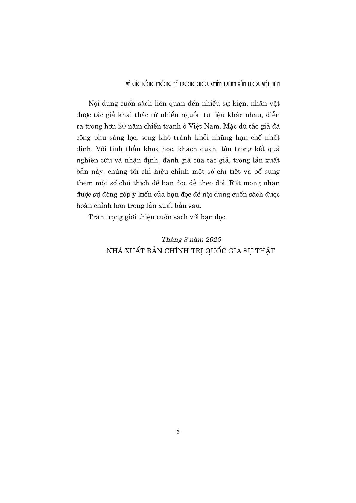 Cuốn sách Về các tổng thống Mỹ trong chiến tranh xâm lược Việt Nam của tác giả Nguyễn Phương Nam - cán bộ lão thành cách mạng 70 năm tuổi Đảng, vốn là một người lính đã kinh qua hai cuộc chiến tranh lớn của đất nước: chống thực dân Pháp và đế quốc Mỹ xâm lược. Bạn đọc khi lật giở từng trang sách sẽ nhận ra ông vừa là nhân chứng của lịch sử, phân tích, nhìn nhận khách quan nhất về nhiều sự kiện, nhiều nhân vật diễn ra trong hơn 20 năm chiến tranh chống đế quốc Mỹ ở Việt Nam.