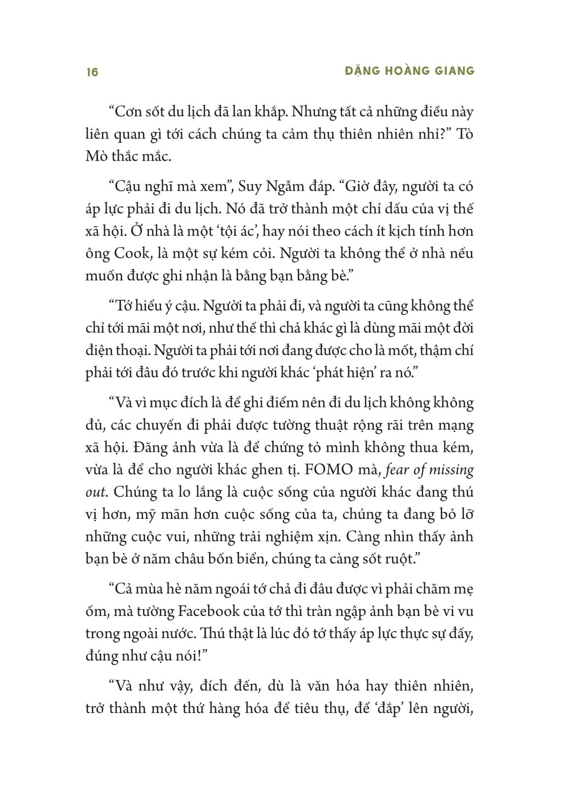 “Có nhiều cách để thưởng thức thiên nhiên quá”, Tò Mò hào hứng, cậu đã sẵn sàng để xuống thuyền. “Chúng ta có thể dùng trí óc, tìm tới kiến thức khoa học để đọc cuốn sách của thiên nhiên, lắng nghe những câu chuyện thiên nhiên kể. Chúng ta có thể dùng thân thể, đắm chìm và hòa m.ình bằng tất cả các giác quan, không chỉ bằng con mắt. Chúng ta có thể dùng tâm, gọi tên những cảm xúc của m.ình, hay đặt m.ình vào những điều trong tự nhiên, dùng hình dung và tưởng tượng để “thấy” những điều mà các giác quan không ghi nhận được, những điều đã xảy ra trong quá khứ hay sẽ xảy ra trong tương lai.”