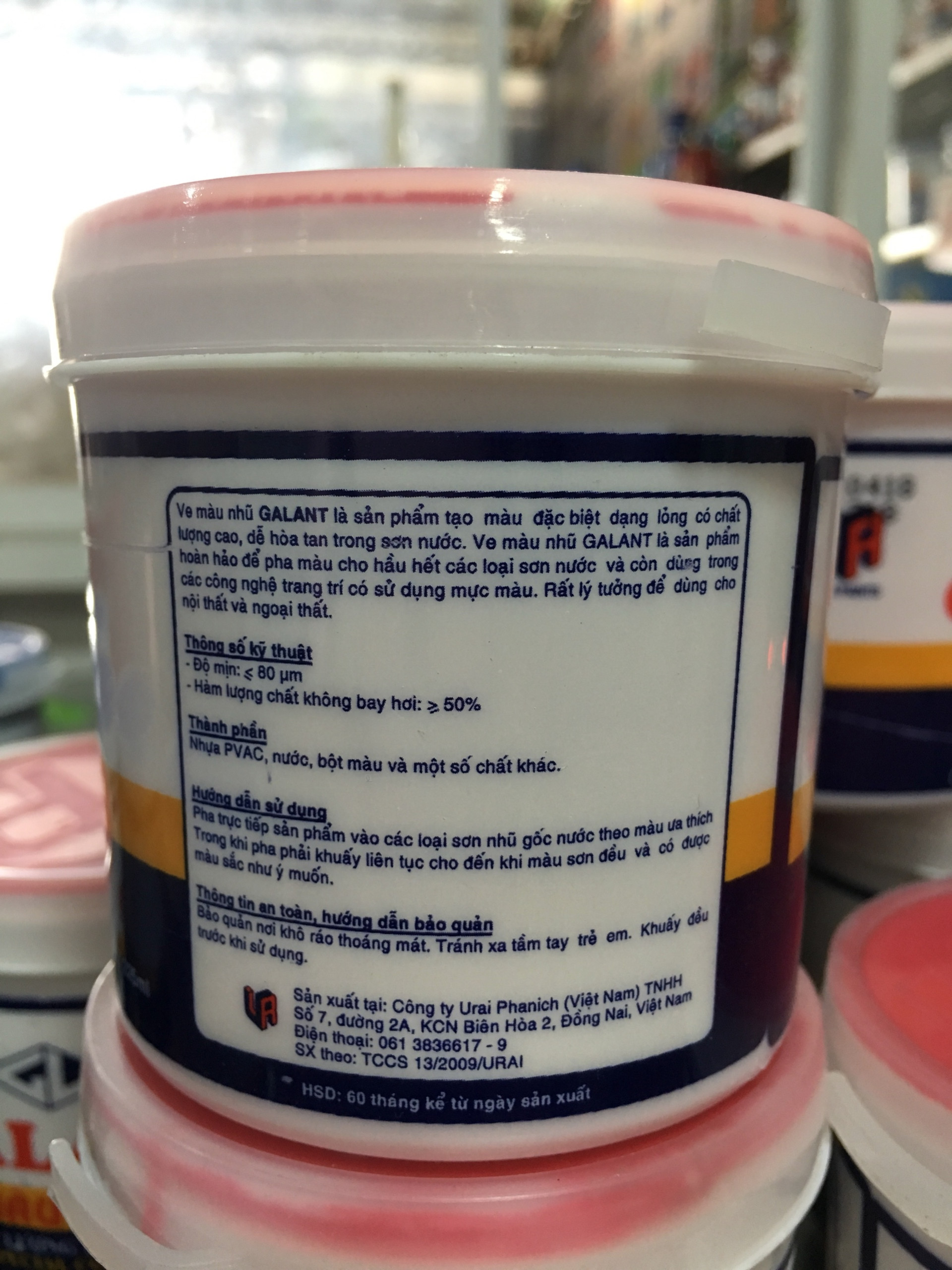 Mua tại TiktokVE MÀU ĐỎ GALANT SP318 - Đơn vị tính: 1 két gồm 12 lon - Ve màu nhũ Galant là sản phẩm hoàn hảo để pha màu cho hầu hết các loại sơn nước và còn dùng trong các công nghệ trang trí có sử dụng mực màu. - Thành phần: Nhựa PVAC, nước, bột màu và một số chất khác. - Đóng gói: 225ml/lon. - Hướng dẫn sử dụng: Pha trực tiếp sản phẩm vào các loại sơn nhũ gốc nước theo màu ưa thích. Trong khi pha phải khuấy liên tục cho đến khi màu sơn đều và có được màu sắc như ý muốn. Sản phẩm được phân phối bởi: Công ty TNHH Lộc Nam Việt 1933, QL51, Phước Tân, Biên Hòa, Đồng Nai '0948 79 5588'