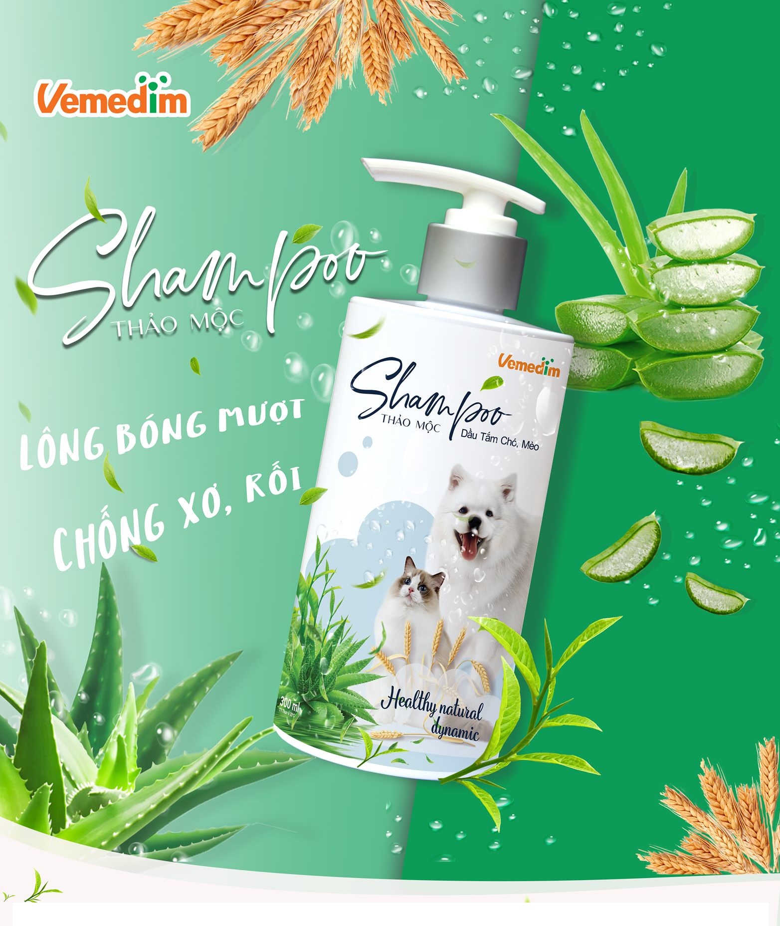 Vemedim Shampoo thảo mộc được bổ sung chiết xuất yến mạch, nha đam, tinh dầu trà, và một số dưỡng chất thiên nhiên, giúp làm mềm dịu và cân bằng độ ẩm cho da, khử mùi hôi của da lông. Giúp thú cưng của bạn có bộ lông bóng mượt, chống xơ rối.