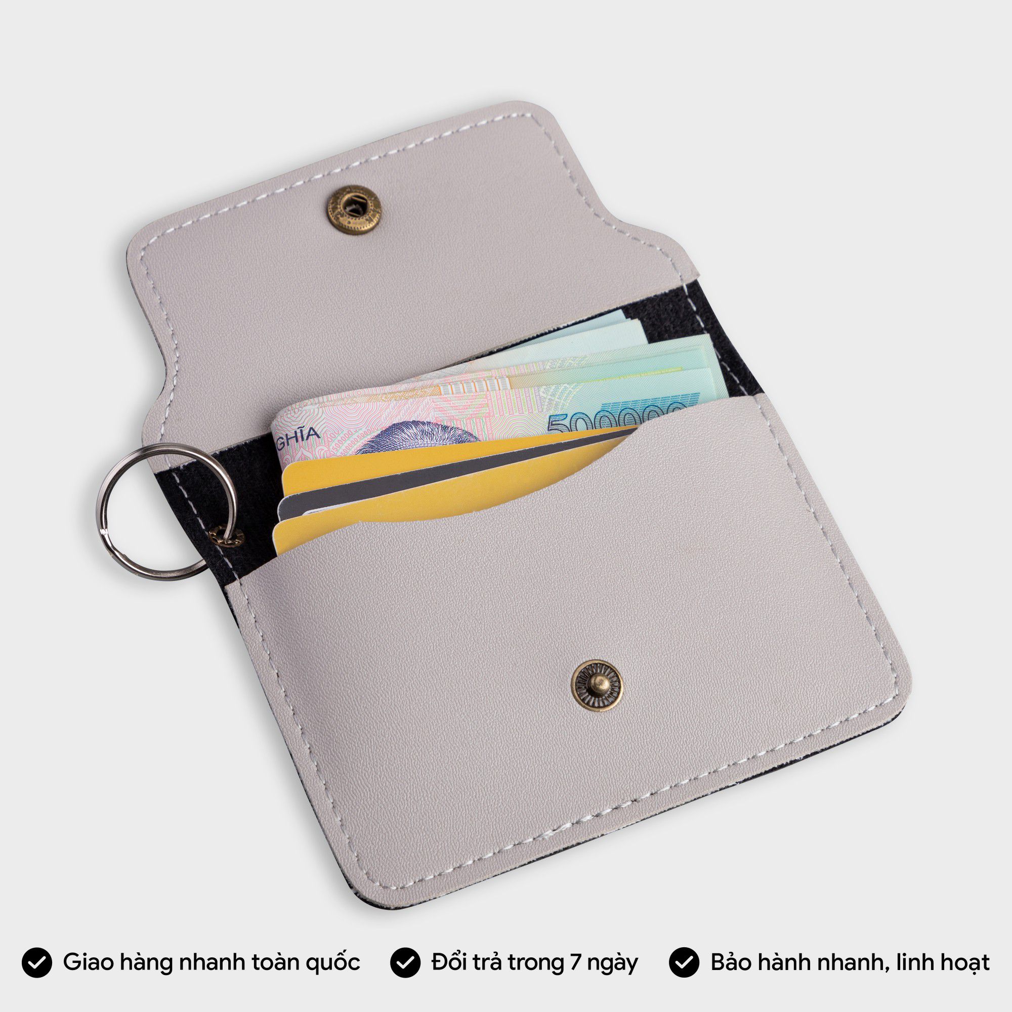 Sản phẩm móc khóa được thiết kế cho chìa khóa : Xe, tủ, nhà,… hoặc có thể đựng thẻ namecard, phiếu giữ xe, tiền xu…