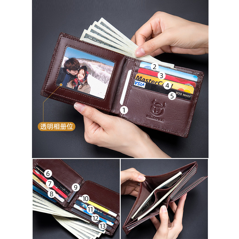 - Màu sắc đặc trưng : Đen, Nâu - Kích thước tối giản : 12 x 10.5 cm - Chất liệu : 100% Da bò cao cấp - Thiết kế gồm 2 ngăn lớn, 1