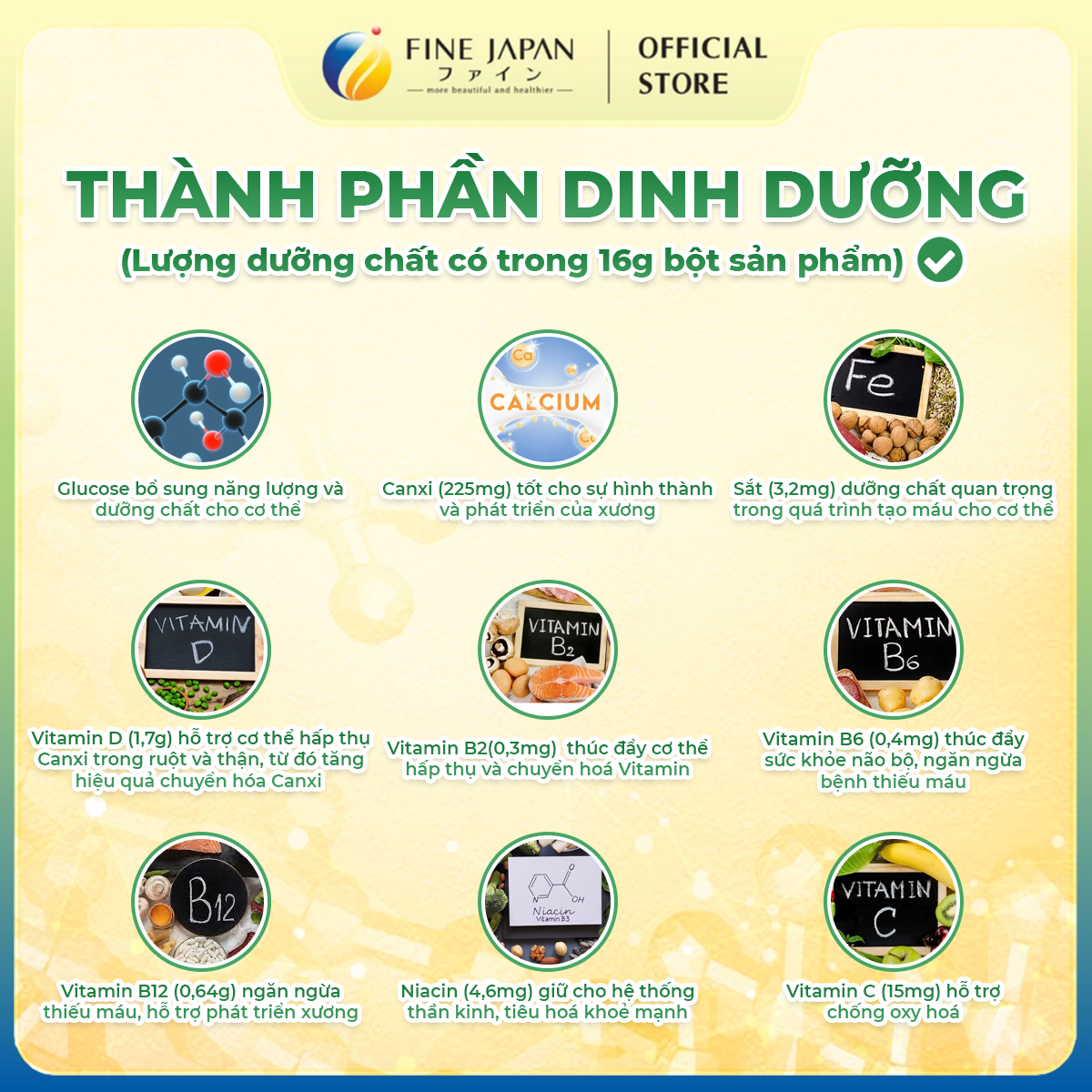 [Vị trái cây tổng hợp] Bột Canxi cá tuyết Bone's Calcium for Kids Vegetable Plus FINE JAPAN bổ sung Canxi & rau củ quả gói 128g Bone's Calcium for Kids Vegetable Plus là sản phẩm Canxi hữu cơ được chiết xuất từ xương lưng cá tuyết Nhật Bản chất lượng cao. Cá tuyết được tuyển chọn kĩ càng, công nghệ chiết xuất tiên tiến tạo ra phân tử Canxi siêu nhỏ, giúp tăng tỷ lệ hấp thụ cao hơn gấp 1,35 lần so với sữa Không chỉ bổ sung Canxi mà còn bổ sung các Vitamin thiết yếu cần thiết cho quá trình hấp thu Canxi của cơ thể như Vitamin D, Vitamin B2/B6/K2.  ■ Canxi đóng vai trò quan trọng trong đối với các chức năng khác nhau trong cơ thể (phát triển cơ thể, tăng sức khỏe xương và răng, cải thiện hệ truyền dẫn thần kinh, các hoạt động cơ bắp và tế bào). Đặc biệt trẻ em đang trong thời kì phát triển. Tuy nhiên, có rất nhiều trẻ bị dị ứng với sữa bò, vốn là một thực phẩm rất giàu Canxi. Nếu lượng Canxi hấp thu không đủ thì sự phát triển bị hạn chế và mật độ xương sẽ giảm, làm tăng nguy cơ bị loãng xương. Hơn nữa, bột Canxi từ cá tuyết có tỷ lệ hấp thụ cao hơn gấp 1,35 lần so với sữa. ■ Vitamin D kết hợp cùng Canxi giúp thúc đẩy sự hấp thụ Canxi tốt hơn. Hỗ trợ xương và răng khỏe mạnh, hiệu quả trong việc ngăn ngừa bệnh còi xương và loãng xương Bone's Calcium for Kids Vegetable Plus bổ sung thêm 6 loại rau củ, trái cây thơm ngon dễ uống. ■ Việc ăn rau củ giàu chất dinh dưỡng, đa dạng giúp cung cấp nhiều loại dưỡng chất và Vitamin quan trọng cho sự phát triển của trẻ. Bone's Calcium for Kids Vegetable Plus giúp hình thành thói quen ăn uống dinh dưỡng và khoa học, tốt cho sự tăng trưởng và phát triển lành mạnh của trẻ. ► KHỐI LƯỢNG TỊNH: 128g  ► THƯƠNG HIỆU: FINE JAPAN  ► XUẤT XỨ: Nhật Bản    ► ĐỐI TƯỢNG SỬ DỤNG:  Trẻ em từ 1 tuổi trở lên. 1-2 tuổi: Một muỗng mỗi ngày giúp bé mọc răng và tăng cường khả năng miễn dịch 3-6 tuổi: Một muỗng mỗi ngày cung cấp đủ lượng Canxi cần thiết cho sự phát triển của xương Trẻ em đang trong thời kỳ phát triển chiều cao, thể lực. 7-13 tuổi: Mỗi ngày 2 muỗng, hỗ trợ tăng trưởng chiều cao nhanh chóng 14-20 tuổi: Mỗi ngày 2 muỗng, bổ sung đủ lượng Canxi cần thiết trong giai đoạn vàng tăng trưởng chiều cao Trẻ suy dinh dưỡng, trẻ còi xương. Trẻ lười ăn rau  Dùng cho người già, người có dấu hiệu bị loãng xương. ► CÔNG DỤNG:  Bổ sung Canxi, Sắt và Vitamin D cho trẻ. Hỗ trợ hấp thu Canxi và phát triển chiều cao cho trẻ em đang trong giai đoạn phát triển thể chất lành mạnh của trẻ. Mỗi giai đoạn tăng trưởng của trẻ đều rất quan trọng, thiếu hụt Canxi ở bất kì lứa tuổi nào đều ảnh hưởng đến sự phát triển chiều cao trong tương lai. Giúp hệ xương và răng phát triển khỏe mạnh, hỗ trợ phòng còi xương ở trẻ em và loãng xương ở người lớn. Hỗ trợ tăng trưởng toàn diện cho trẻ. Bổ sung thêm dưỡng chất từ  6 loại rau/trái cây với hương vị trái cây tổng hợp thơm ngon dễ uống, giúp cung cấp nhiều loại dưỡng chất quan trọng và chất xơ cho sự phát triển của trẻ. Giúp tăng trưởng và phát triển thể chất, cải thiện thể lực cho bé, hình thành thói quen ăn uống dinh dưỡng và khoa học.  ► THÀNH PHẦN DINH DƯỠNG: (Lượng dưỡng chất có trong 16g bột sản phẩm) Glucose bổ sung năng lượng và dưỡng chất cho cơ thể  Canxi (225mg) tốt cho sự hình thành và phát triển của xương Sắt (3,2mg) dưỡng chất quan trọng trong quá trình tạo máu cho cơ thể Vitamin D (1,7g) hỗ trợ cơ thể hấp thụ Canxi trong ruột và thận, từ đó tăng hiệu quả chuyển hóa Canxi  Vitamin B2(0,3mg)  thúc đẩy cơ thể hấp thụ và chuyển hoá Vitamin Vitamin B6 (0,4mg) thúc đẩy sức khỏe não bộ, ngăn ngừa bệnh thiếu máu Vitamin B12 (0,64g) ngăn ngừa thiếu máu, hỗ trợ phát triển xương Niacin (4,6mg) giữ cho hệ thống thần kinh, tiêu hoá khoẻ mạnh Vitamin C (15mg) hỗ trợ chống oxy hoá   ► HƯỚNG DẪN SỬ DỤNG:  Pha 2 thìa sản phẩm (8g) với sữa/sữa đậu nành hoặc các loại đồ uống yêu thích (100ml)  Khuấy đều cho đến khi tan hết và sử dụng. Sử dụng 2 lần/ngày. Tốt nhất là dùng buổi sáng và  trước 14h chiều vì đây là thời điểm hấp thụ Canxi tốt nhất trong ngày. Với người dị ứng sữa có thể pha bột Canxi cá tuyết với nước ấm ► HẠN SỬ DỤNG: 24 THÁNG KỂ TỪ NGÀY SẢN XUẤT.   ► HƯỚNG DẪN BẢO QUẢN: Sử dụng sớm sau khi mở gói Bảo quản nơi khô ráo, thoáng mát, tránh ánh nắng chiếu trực tiếp Để xa tầm với của trẻ   ► LƯU Ý: Sản phẩm này không nhằm mục đích chữa khỏi bất kỳ bệnh nào cũng như không tăng cường sức khỏe nhanh chóng khi tăng lượng dùng. Vui lòng tuân thủ lượng sử dụng hàng ngày được khuyến nghị. Sau khi xé vỏ, vui lòng đóng chặt gói và sử dụng sớm Nếu bạn cảm thấy không phù hợp với cơ thể xin giảm liều lượng dùng hoặc ngừng sử dụng Có thể có sự khác biệt nhỏ về mùi vị và màu sắc tùy theo lô sản