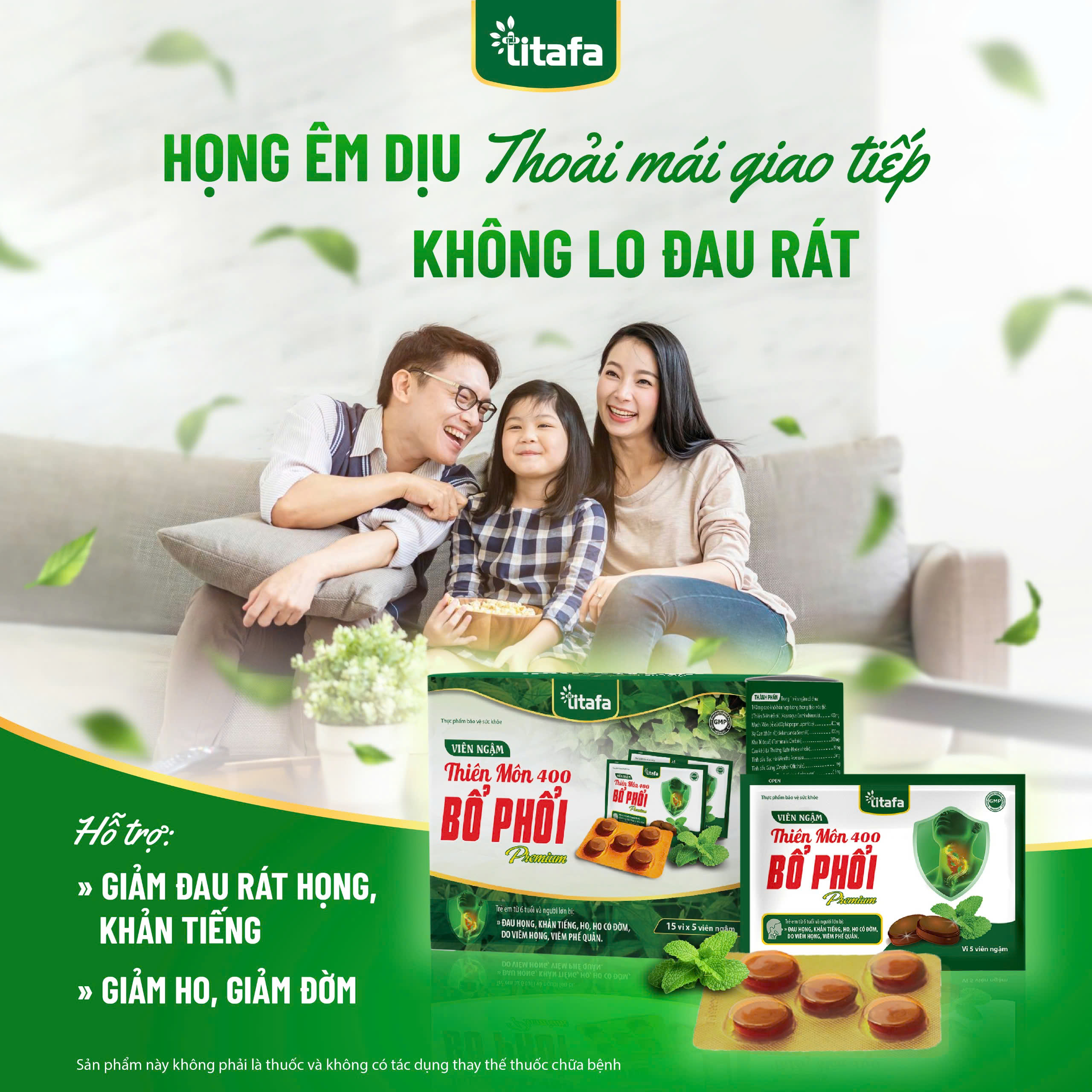 Công dụng: Hỗ trợ thanh họng, hạn chế ho nhiều, giảm tăng tiết đờm dãi Đối tượng sử dụng: Người ho khan, ho có đờm, ho do thay đổi thời tiết, cảm lạnh Thành phần
