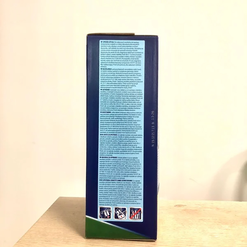 Hộp 90v viên rửa chén Finish All In 1 Dishwasher Tablets (là viên rửa chén cao cấp chuyên dùng cho máy rửa chén). - Nhà sản xuất: Reckitt Benckiser - Trọng lượng: 1440g. Finish là một nhãn hiệu sản phẩm rửa bát tại CHLB Đức, với lịch sử tồn tại lâu đời trên thị trường châu Âu, sau đó lấn dần sang châu Á và nhanh chóng thích nghi cũng như nhận được sự ủng hộ và tin tưởng của các bà nội trợ, finish càng khẳng định được vị trí thống trị của mình trên thị trường sản phẩm rửa bát
