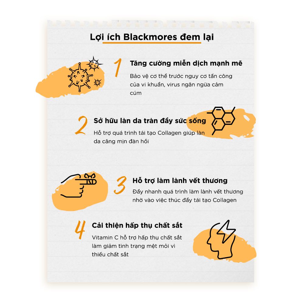 Thành phần Hoạt chất mỗi Viên C Blackmores 1000mg: Ascorbic Acid 400mg, Sodium ascorbate 350mg, Hesperidin 50mg, Rutoside 50mg, Rosa canina extract (chiết xuất quả tầm xuân) tương đương 250mg quả khô Citrus bioflavonoids extract (chiết xuất cam, quýt, chanh) 125mg. Malpighlia punicifolia (Acerola) chiết xuất tương đương với 50mg trái khô. Công dụng Bổ sung vitamin C, hỗ trợ tăng cường sức khỏe, hỗ trợ chống oxy hóa. Đối tượng sử dụng Người trưởng thành. Trẻ em từ 4-12 tuổi chỉ sử dụng theo chỉ dẫn của chuyên gia Cách sử dụng Người lớn dùng 1 viên hằng ngày trong bữa ăn hoặc theo chỉ định của chuyên gia. Bảo quản: Bảo quản ở nhiệt độ dưới 30 độ C, ở nơi khô ráo, thoáng mát, tránh ánh nắng trực tiếp. Đóng gói: Hộp 31 viên Xuất xứ thương hiệu: Úc Chịu trách nhiệm đưa sản phẩm ra thị trường Công ty TNHH Dịch Vụ và Thương Mại Mesa Số giấy XNQC: 00333/2018/ATTP-XNQC