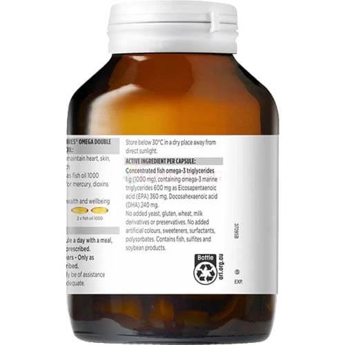 Viên uống Blackmores Omega Double High Strength Fish Oil Thành phần: Omega-3: 600mg tương đương: Eicosapentaenoic acid (EPA): 360mg, Docosahexaenoic acid (DHA): 240mg Công dụng: + Hỗ trợ quá trình lão hoá của não