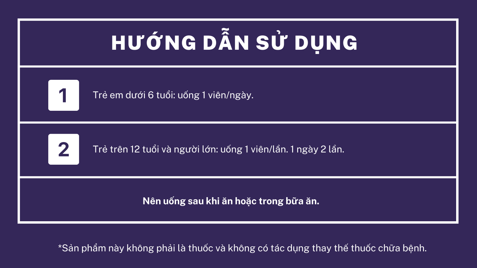 • Trẻ em dưới 6 tuổi: uống 1 viên/ngày.