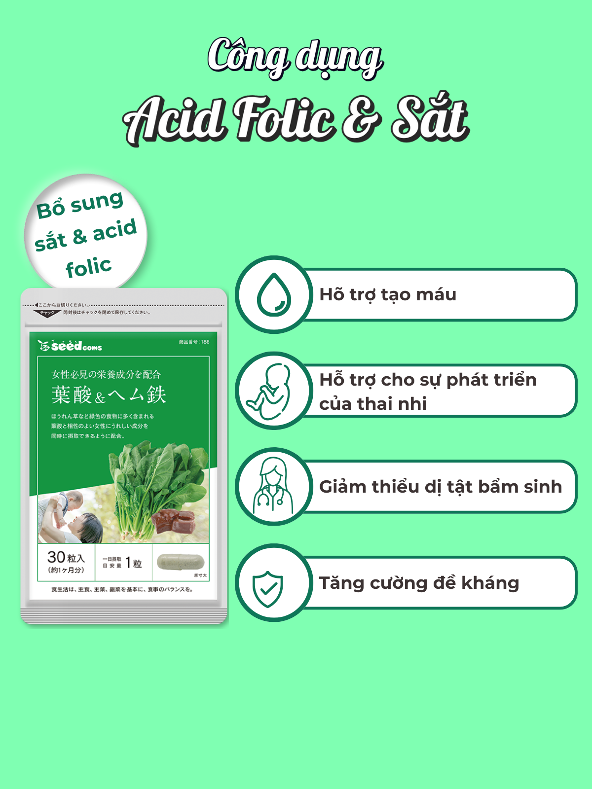 ✨Viên Uống Bổ Sung Acid Folic & Sắt Hỗ Trợ Bổ Máu Seedcoms Nhật Bản