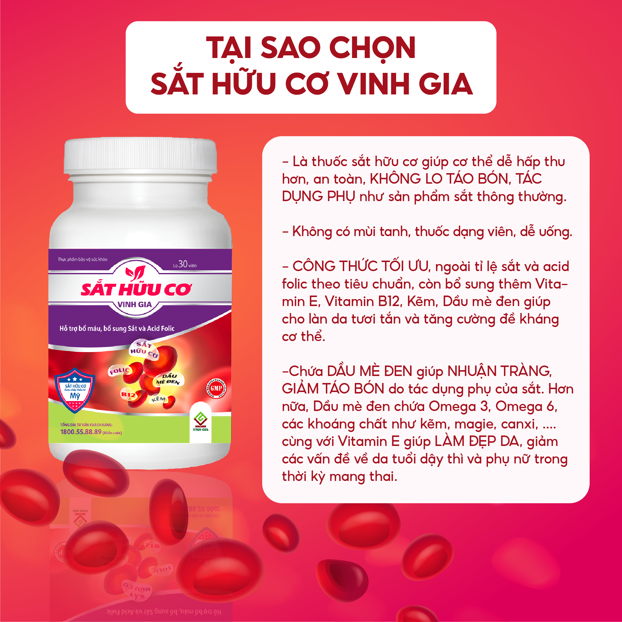 Viên Sắt hữu cơ Vinh Gia với thành phần chính là sắt (dưới dạng hữu cơ) Acid Folic, Vitamin B12 giúp hỗ trợ giảm nguy cơ và triệu chứng do thiếu máu, thiếu sắt.