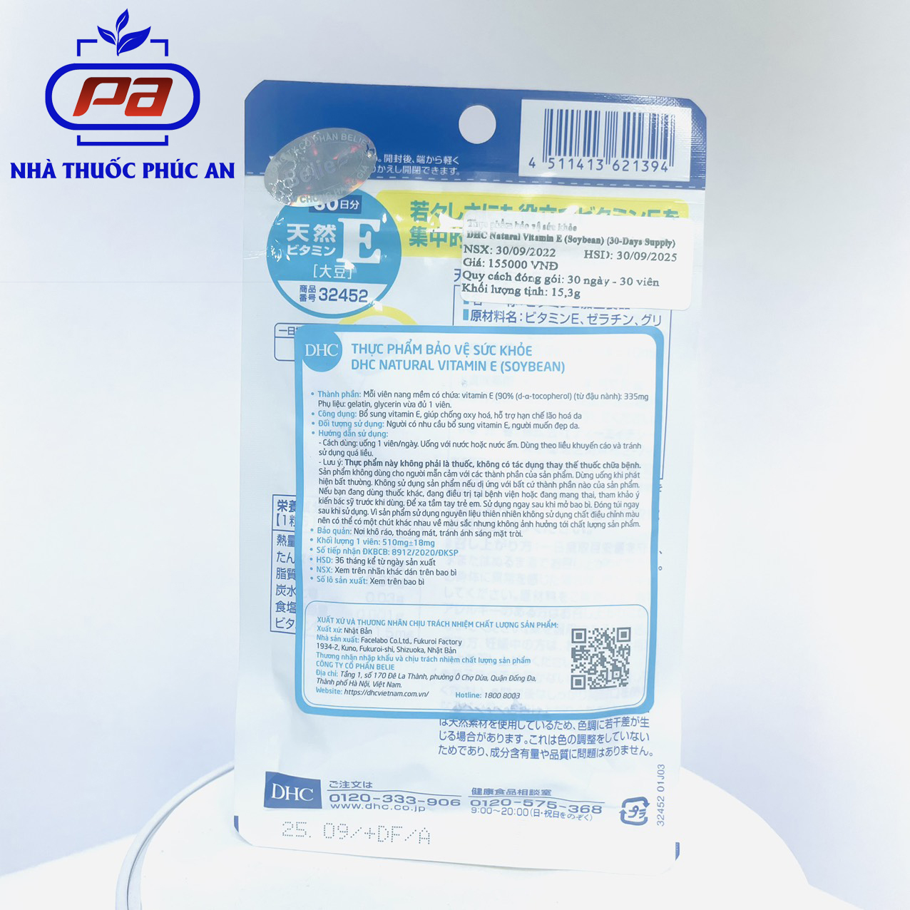 • Viên uống vitamin E DHC chứa 301.5mg vitamin E dưới dạng d-alpha tocopherol hoạt tính cao được chiết xuất hoàn toàn tự nhiên từ đậu nành mang đến hiệu quả chống oxy hóa, ngăn ngừa lão hóa tốt hơn.