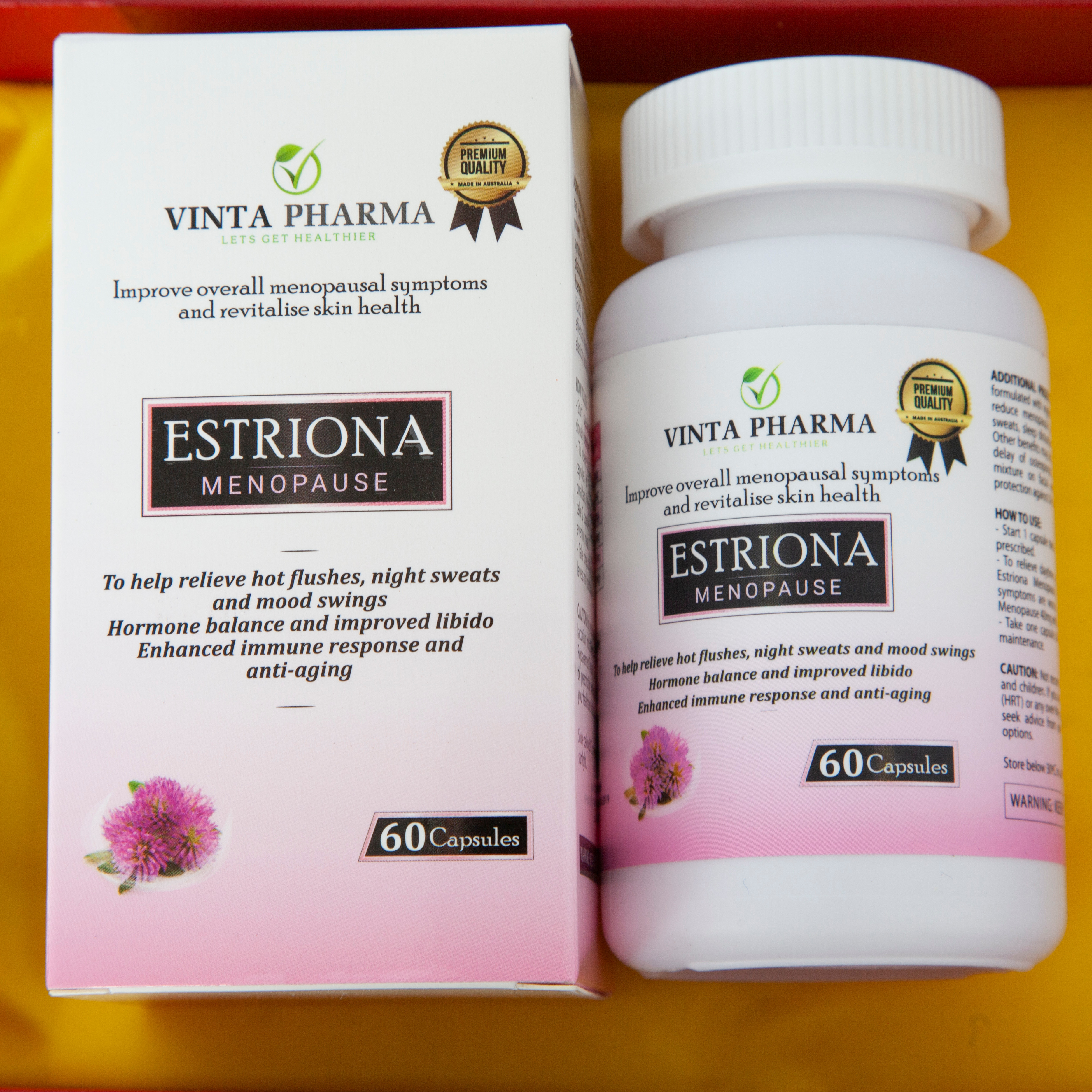 "Sản phẩm này không phải là thuốc, không có giá trị thay thế thuốc chữa bệnh" ESTRIONA (MENOPAUSE), sản phẩm được chiết xuất từ các tinh chất quý hiếm từ thiên nhiên và hỗn hợp dẫn xuất vitamin, hỗ trợ hiệu quả: chống lão hóa, trẻ hóa làn da và cải thiện nếp nhăn; giảm các triệu chứng tiền, mãn kinh ở phụ nữ; tăng cường sức khỏe, giảm mệt mỏi, lo âu, rối loạn giấc ngủ. ESTRIONA (MENOPAUSE)- mang lại sức sống căng tràn và tươi sáng cho làn da của bạn. Thành Phần Công Thức ESTRIONA (MENOPAUSE) – Sự phối hợp hoàn hảo của các tinh chất thiên nhiên và hỗn hợp dẫn xuất vitamin. Đậu chẻ ba hoa đỏ (Red Clover) 2,5g tương đương Isoflavones  40mg Dầu hạt nho (Grapeseedoil) 200mg Canxi cacbonat 125mg Magieoxit  66mg Dịch chiết hạt nho (Grape seed extract) 20mg Astaxanthin 3mg Các thành phần khác: Magnesium stearate, Cellulose microcrystalline, Colloidal silica Anhydrous.   Công Dụng Estriona Menopause là công thức dựa vào bằng chứng khoa học với các thành phần thực vật kết hợp Astaxanthin và khoáng chất có nguồn gốc từ thiên nhiên, hỗ trợ: – Chống lão hóa, trẻ hóa da thông qua quá trình làm chậm sự xuất hiện của các nếp nhăn, giữ ẩm cho da, cải thiện độ đàn hồi và bảo vệ da chống lại tia cực tím. – Giảm các triệu chứng tiền mãn kinh, mãn kinh bao gồm các cơn bốc hỏa, đổ mồ hôi đêm, rối loạn giấc ngủ, lo âu… – Cải thiện tình trạng khô âm đạo, Libido (ham muốn tình dục). – Làm chậm quá trình loãng xương và cải thiện sức khỏe tim mạch. Đối Tượng Sử Dụng Phụ nữ đang trong giai đoạn tiền mãn kinh và mãn kinh. Phụ nữ trải qua mãn kinh sớm hoặc suy buồng trứng sớm do buồng trứng ngừng hoạt động tự nhiên. Phụ nữ trong tình trạng giảm nội tiết tố do cắt bỏ buồng trứng, tử cung. Cách Sử Dụng Khởi đầu 1 viên x 2 lần/ngày sau bữa ăn vào buổi sáng và buổi tối. Để giảm các triệu chứng vào ban ngày, có thể dùng 2 viên sau bữa ăn sáng. Nếu các triệu chứng vào ban đêm tệ hơn, có thể dùng 2 viên sau bữa ăn tối. Liều duy trì: 1 viên/ngày, hoặc theo chỉ định của chuyên gia y tế. Lưu ý: Với phụ nữ có thai hoặc cho con bú cần tham khảo ý kiến của bác sĩ trước khi sử dụng. Trình Bày Hộp 60 viên nang. Bảo Quản Bảo quản dưới 30 °C, nơi khô mát, tránh ánh nắng mặt trời.