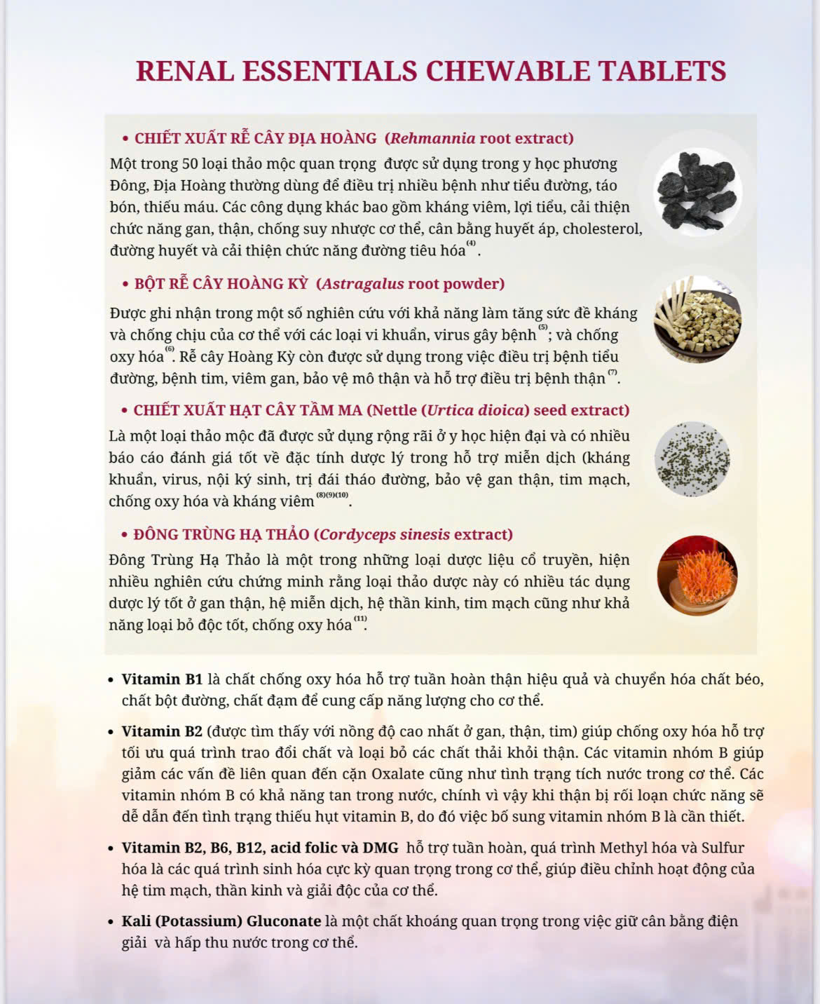 THÀNH PHẦN NGUYÊN LIỆU Vitamin A, D3, E, B1, B2, B3 (vitamin PP, nicotinamide), B5 (Calcium pantothenate), B6, B9 (folic acid), B12, C, K3, Lysine, Methionine, Sodium chloride, Sodium sulfate, Iron sulfate, Magnesium sulfate, Manganese