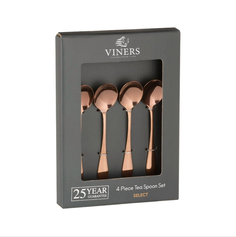 Bộ muỗng trà Select màu đồng 4 món được làm từ thép không gỉ 18/0 được bổ sung thêm titan tăng độ bền. Sản phẩm thích hợp để sử dụng hằng ngày hoặc trong các